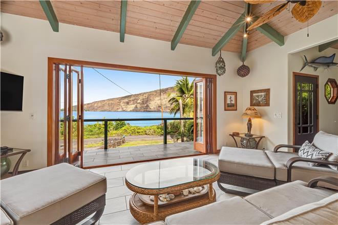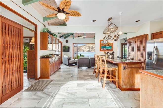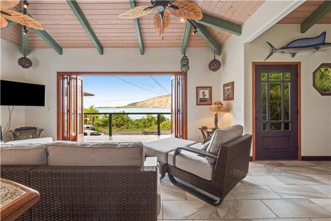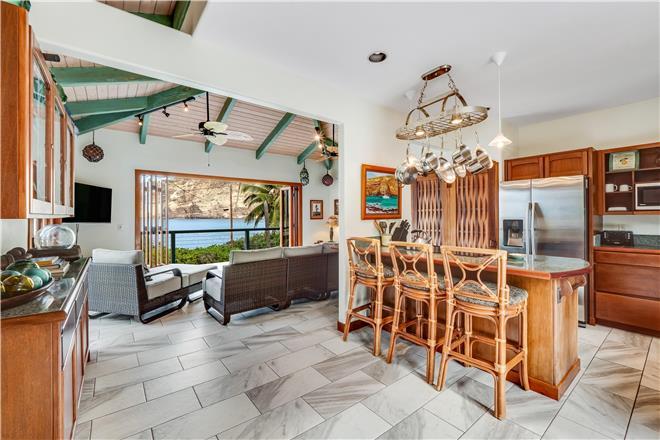 Continue to enjoy tantalizing views back at Manini Beachfront Getaway. The living room is composed of vaulted ceilings, large doors, and cool flooring. Sit back and stream your favorite shows with ease or simply visit with your loved ones about your upcoming itinerary.