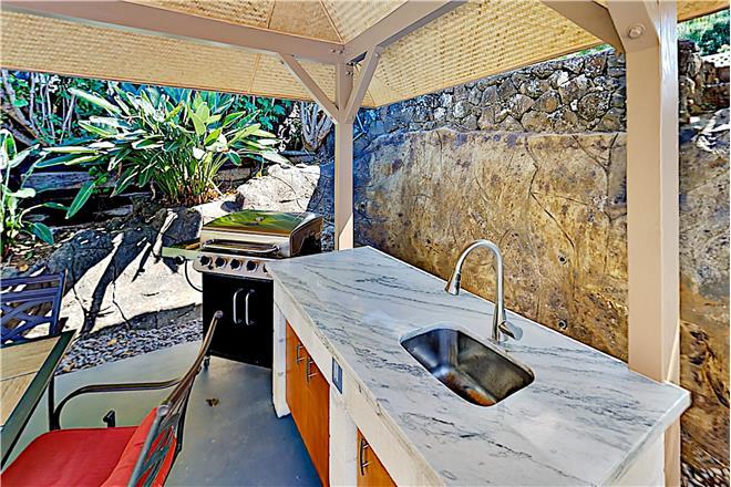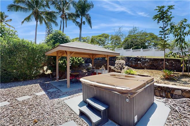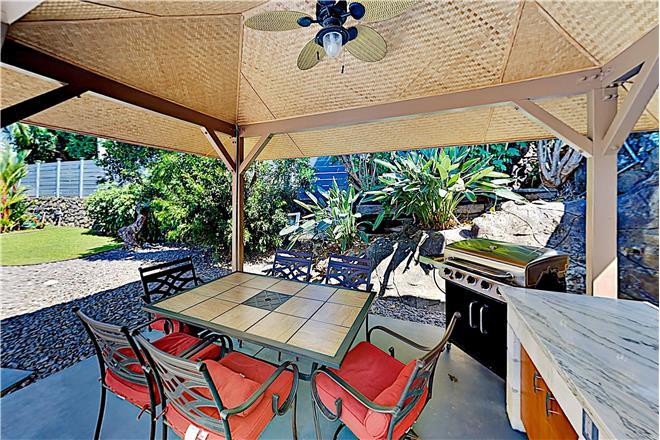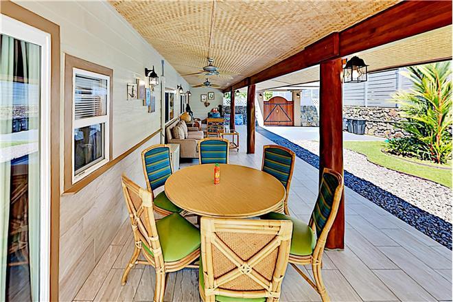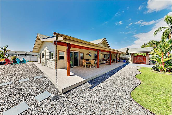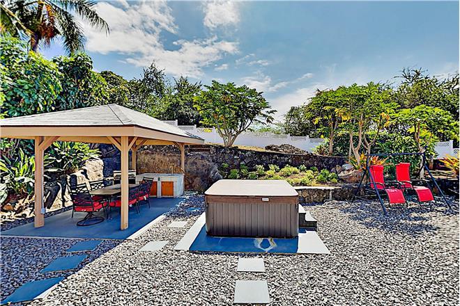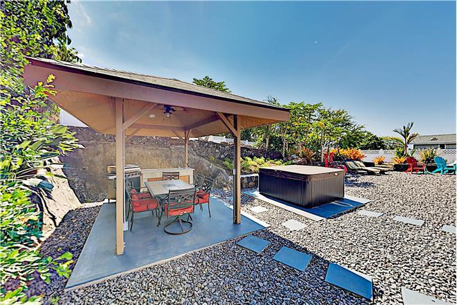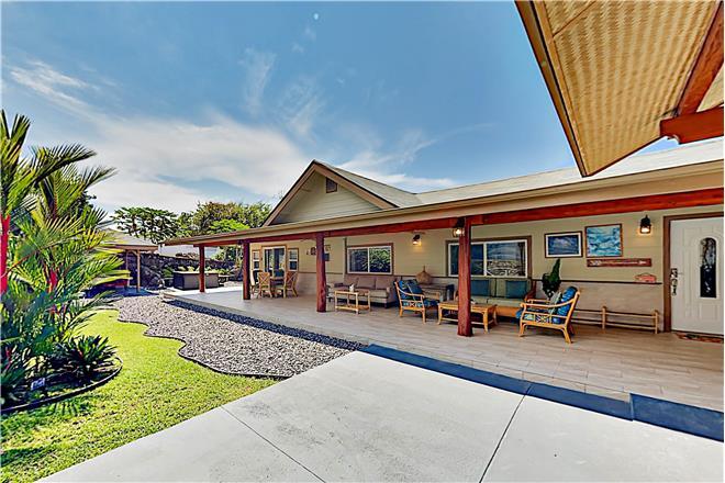 A serene paradise located just two minutes from downtown, this thoughtfully upgraded fivebedroom, fivebath home features abundant indooroutdoor living space the ideal retreat for families or working remote. Enjoy an upscale kitchen and an open interior layout offering sliding glass door access to a sprawling lanai that stretches around the entire property. Bordered by lush landscape, this tropical outdoor oasis boasts Ohia hardwood posts, sleek tile flooring, and grassmatted ceilings. Fully furnished, the front lanai includes two seating areas and an alfresco dining table for five, while the luxurious side lanai is detailed with a lounge area and a dining table. Retreat to the resortstyle yard for more lounge space and rejuvenating soaks in the private hot tub. An adjacent covered gazebo provides another shaded area, outfitted with a gas grill, granite wet bar, and sixseat table.