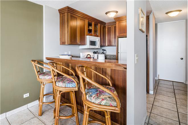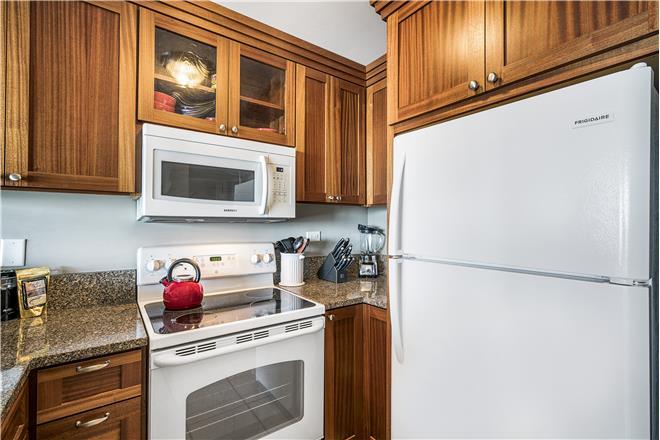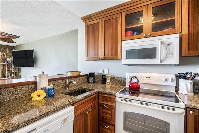 Recently upgraded with granite counters, zebrawood cabinetry, and modern appliances, the kitchen is fully stocked for your stay. Whether youre brewing Kona coffee or preparing fresh island fish, youll find everything from a rice cooker to a blender at your fingertips.