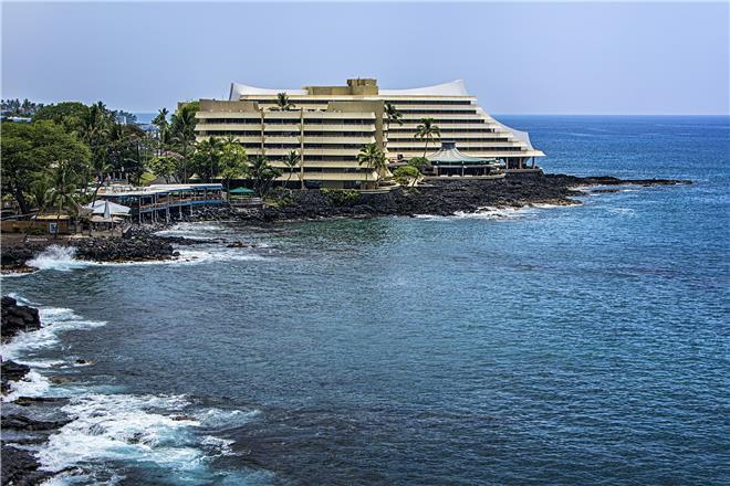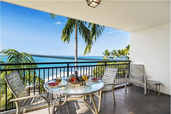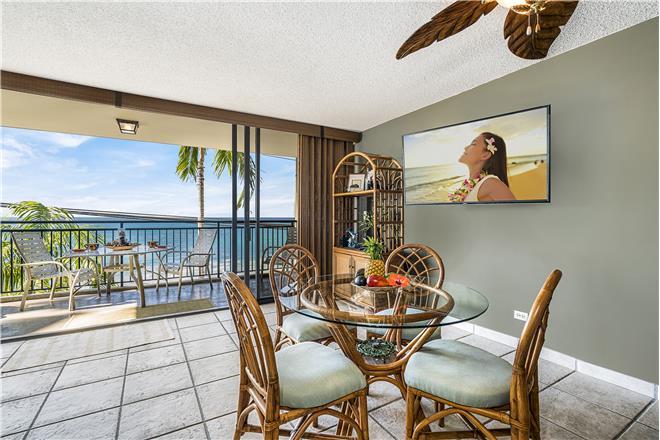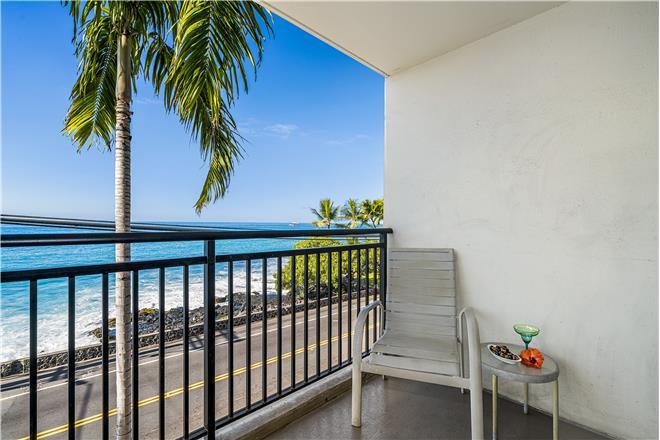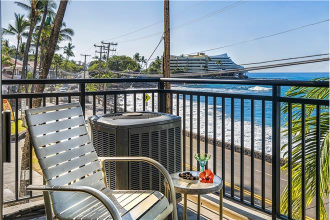 The lanai is your front-row seat to the Pacific. Enjoy breakfast while watching dolphins play in the bay, sip wine at sunset, or simply relax to the rhythmic sound of the waves. From here, you can spot the Royal Kona Hotel and the vibrant activity along the shoreline.
