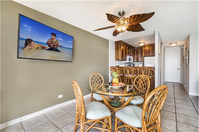 The open-concept living area welcomes you with tropical furnishings, a queen sleeper sofa, and a wall-mounted TV. Large sliding glass doors open to the lanai, letting in ocean breezes and framing postcard-worthy viewsyou can even watch the waves from the couch.