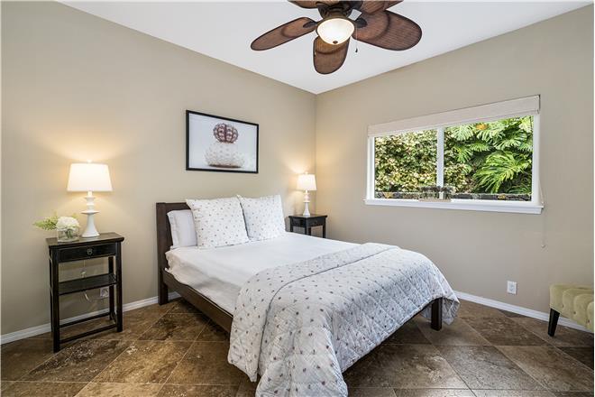 The primary suite offers a king-size bed, ambient lighting, tray ceilings, and direct access to the lanai. The first guest room features a queen-size bed, ceiling fan, and natural light for peaceful mornings. The second guest room includes two twin beds and a breezy tropical ambiance. All bedrooms are air-conditioned and equipped with ceiling fans for maximum comfort. The guest bathroom features a walk-in travertine shower, spacious vanity, and high-quality linens. A full laundry room with a washer and dryer ensures added convenience for long-term stays.