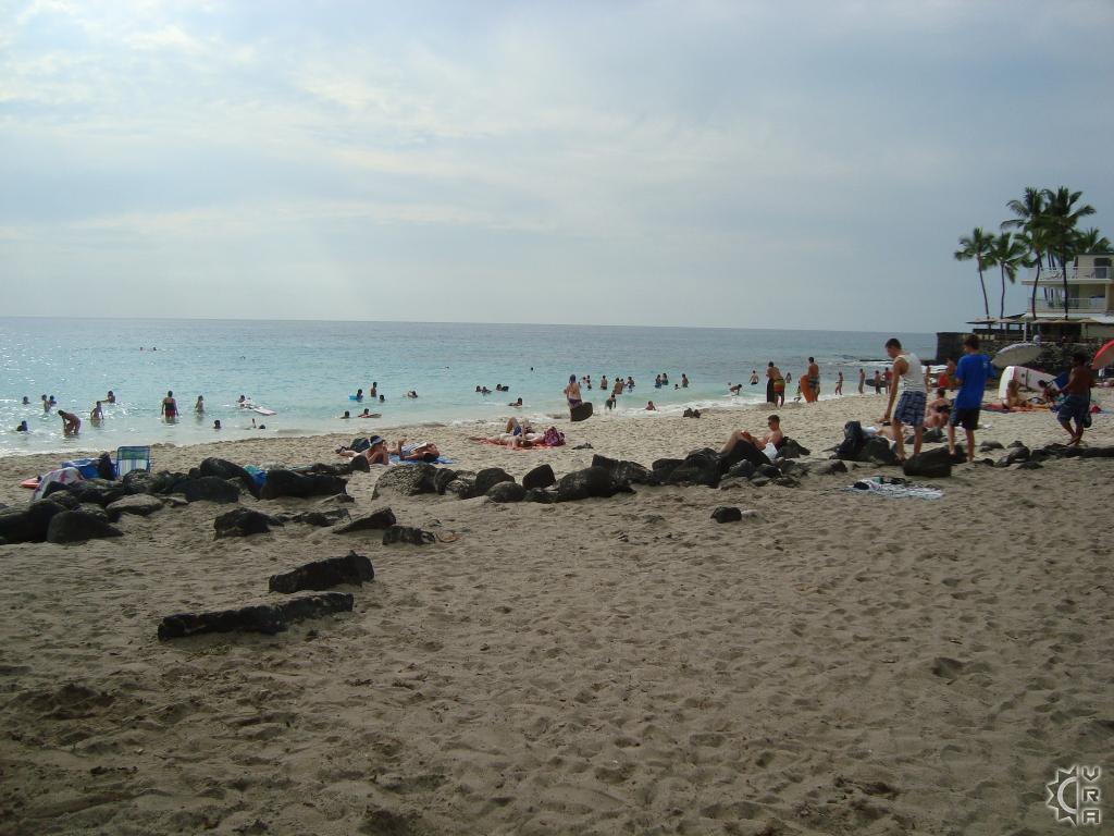 One of only a few stretches of white sand within the Kailua-Kona-Keauhou corridor, the activity at this beach starts early and continues throughout the day. Islanders find this beach one of the best for boogie boarding and surfing. As a result, droves will arrive early and linger throughout the day and through the sunset hour especially during the periods of good surf. Many also find the rocky cove just south of the beach an excellent place for snorkeling and shoreline diving.