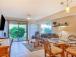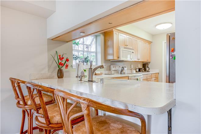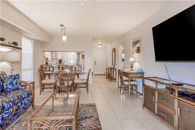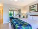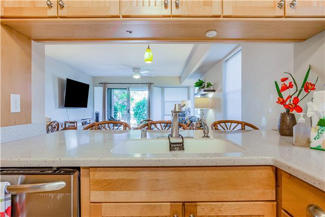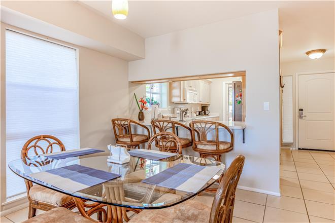 Full of sunshine, tropical patterns, and great amenities, your stay is awaiting your return from a day of exploring. The full kitchen offers the perfect space to whip up a tasty treat while utilizing its ample counter space, stainless steel appliances, and dishwasher. Serve your creation at the nearby breakfast bar and formal dining table.