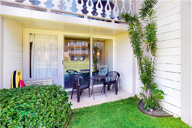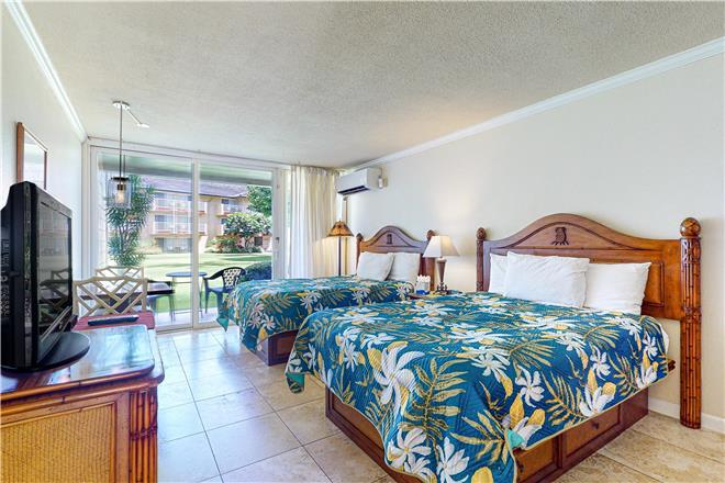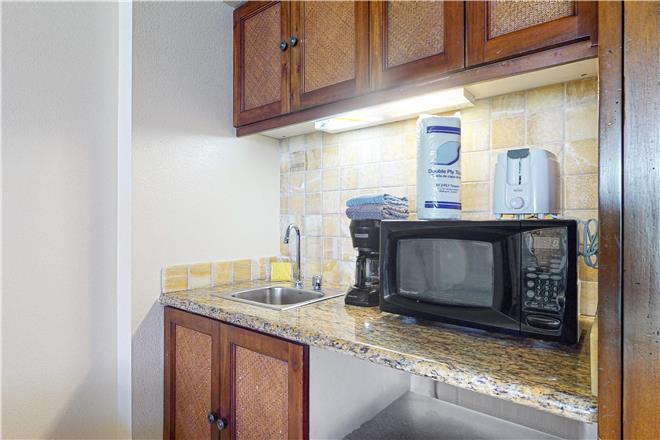 Located in the oceanview Hawaii Building, your groundfloor studio condo is filled with thoughtful touches. Enjoy morning coffee on your private lanai with a lovely view of the ocean and beach sunrises. Whip up beach snacks in the kitchenette with a sink, microwave, minifridge, and coffee maker. Extras include AC, complimentary WiFi lobby only, TV, and beach towels.
