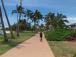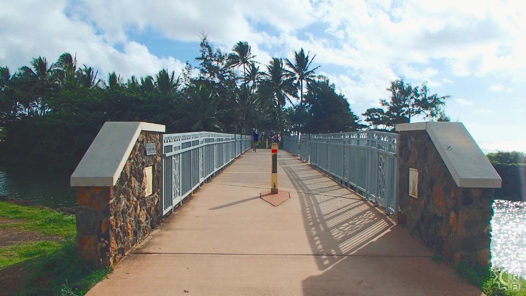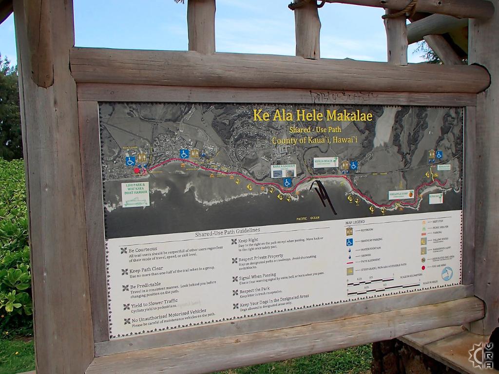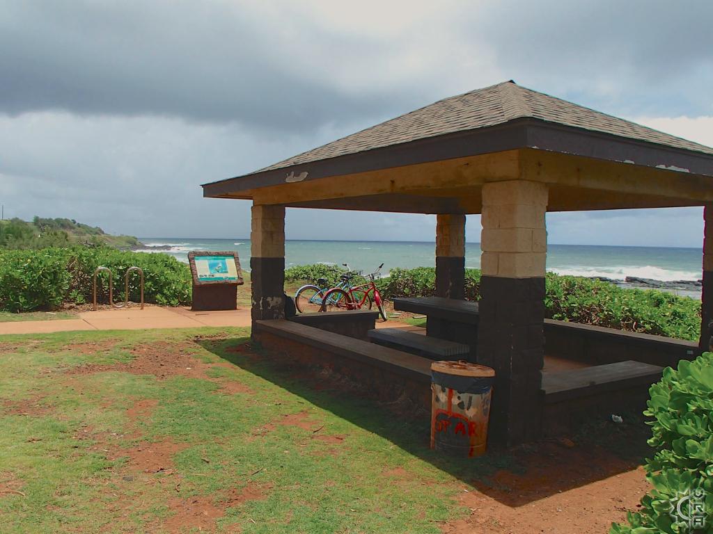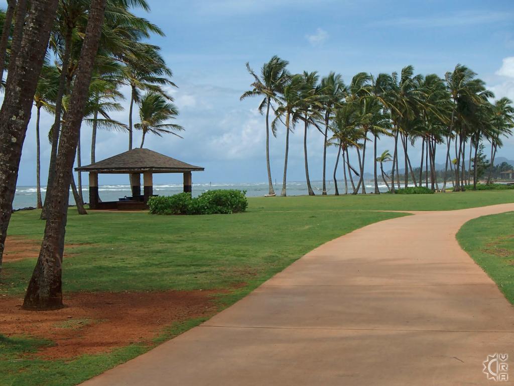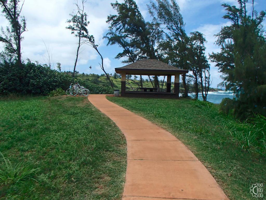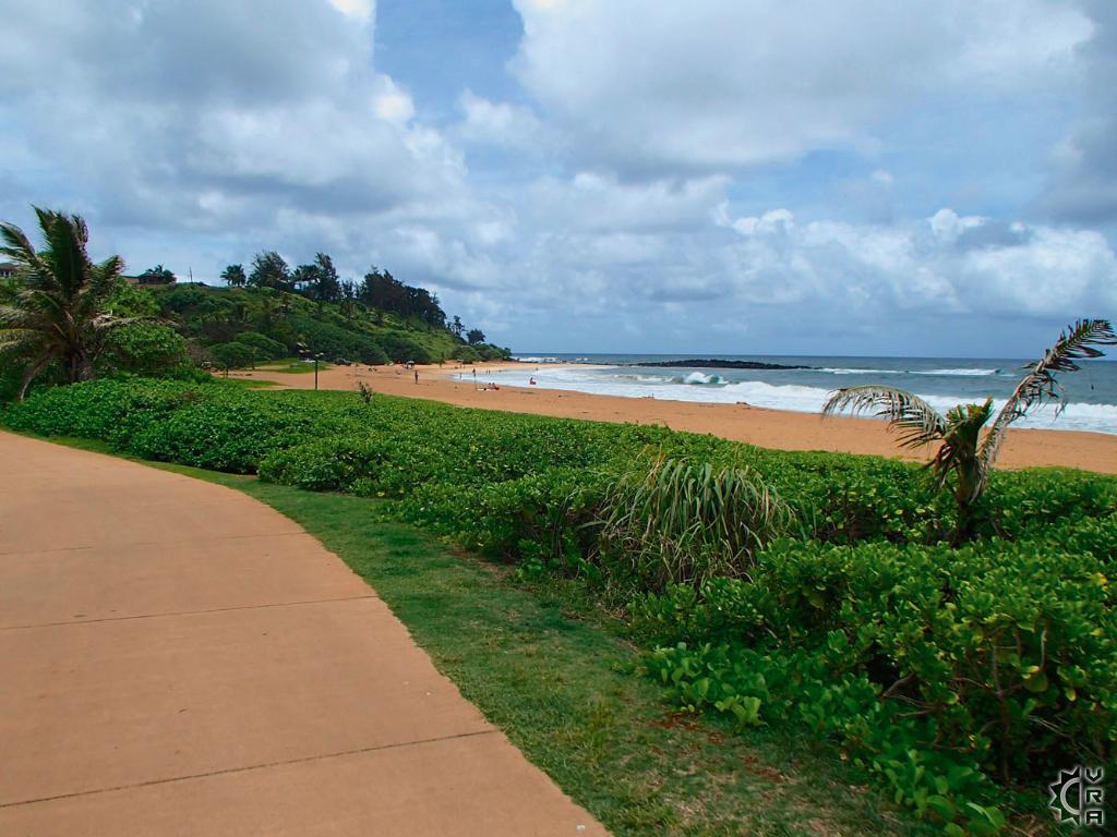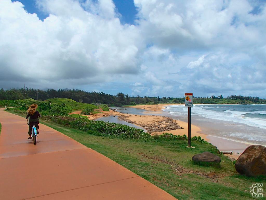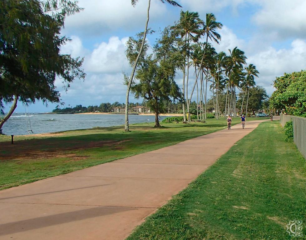 The path runs along the buffer zone between the coastline and the small Kapaa condos and shops. A grassy park surrounds the path and there are numerous picnic benches and rest areas. The bottom end of the pathway reaches Lihi Park, and by using bike lanes you can explore the town center or link toward the path extension in Lydgate Beach Park.