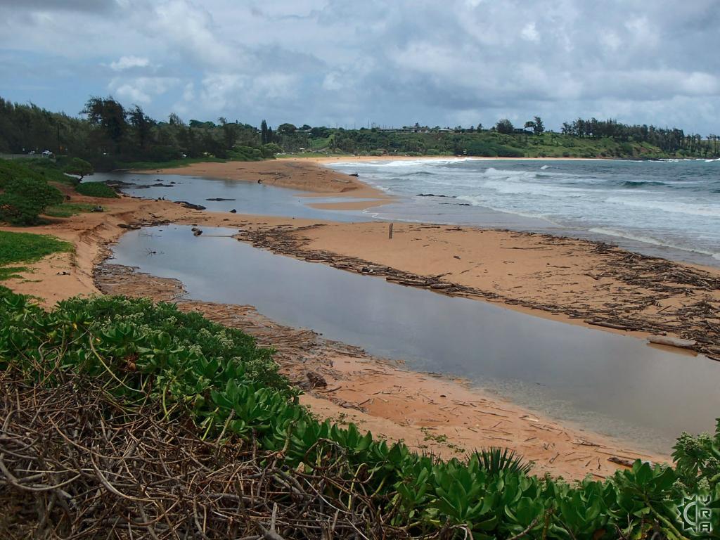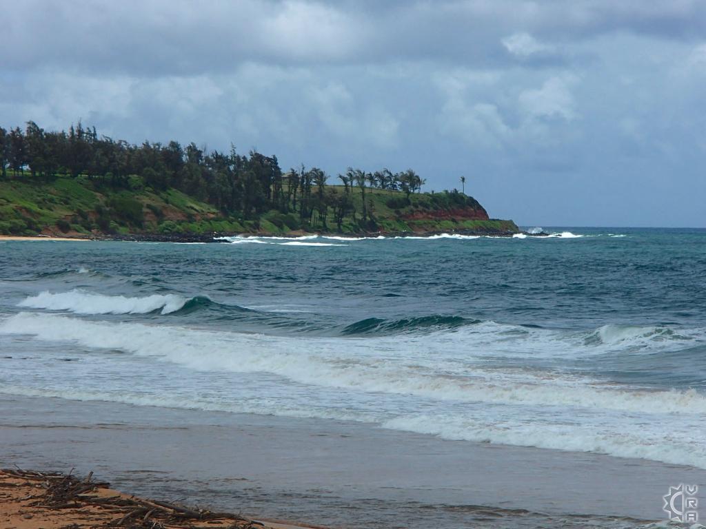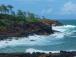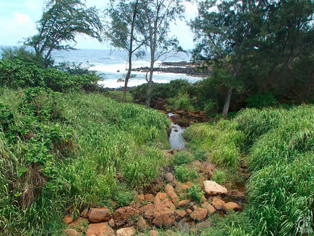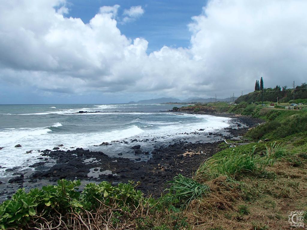 Leaving Kapaa town heading north the path winds along the coast at a 30 foot elevation above lava rock formations and pounding surf. Eventually the path runs along the backside of Kealia Beach and turns up the coast for over a mile of raw coastline and green hills until you reach Kanu Bay, also known as "Donkey's Beach".