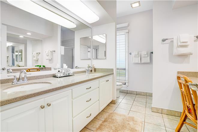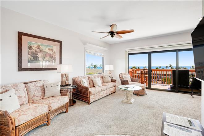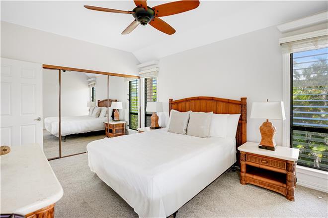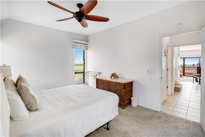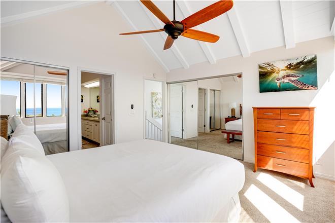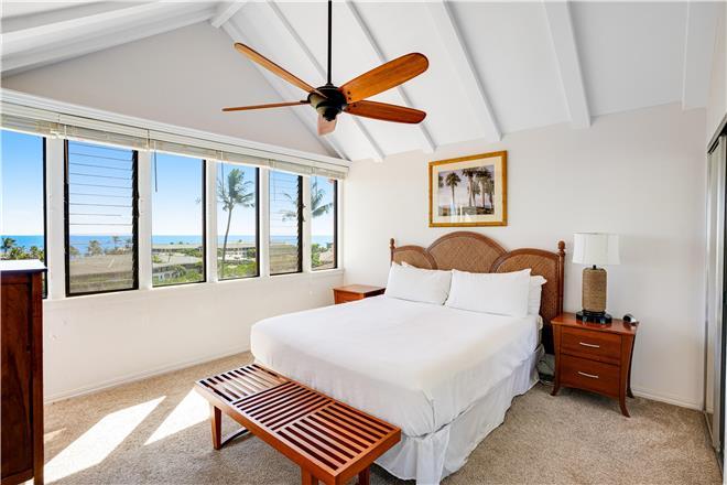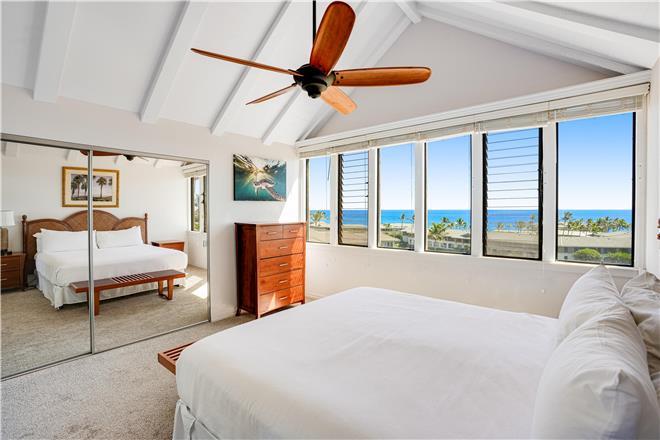 The primary bedroom features a stunning unobstructed ocean view, a king bed, spacious closets, and an en suite bath.