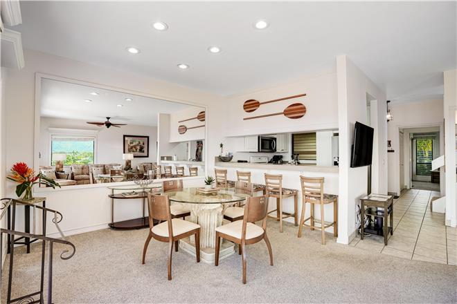 The openconcept living area creates an inviting space for entertaining and spending quality time with family amp friends. The fully equipped, updated kitchen has granite countertops and is a great place to cook gourmet and local fare. The dining room sits just off the kitchen and offers table seating for four and comfortable bartop seating for four.