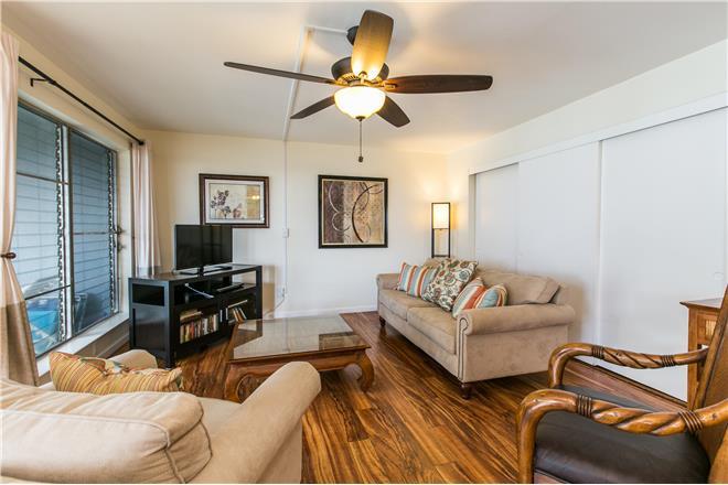 New furnishings and wood laminate flooring add a touch of luxury to the space, while amenities like free WiFi, a private washer and dryer, and beach towels provide all the comforts of home. The living room features floor-to-ceiling patio doors that let in plenty of natural light and offer access to the private lanai. Outside, guests can relax on the deck with multiple levels, a tiki hut, and a plunge pool overlooking the Pacific Ocean.