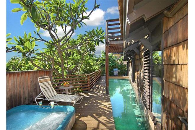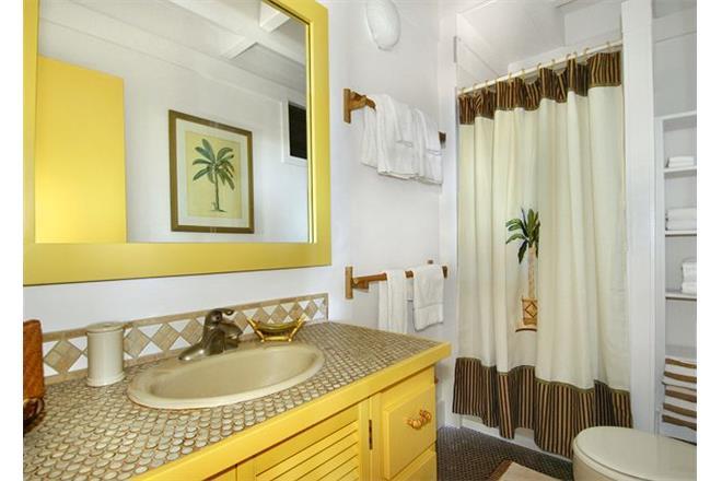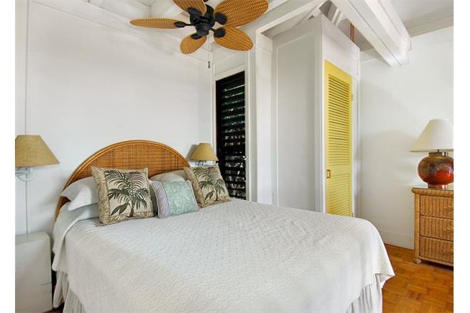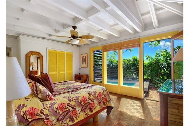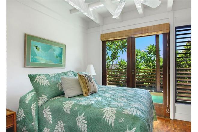 The master suite has a king bed and opens to the ground floor lanai, lap pool, hot tub, BBQ, and landscaped, private, outdoor shower. The second bedroom has a queen bed, and the third bedroom with den has a full bed and a queen bed. These two rooms are connected to a bath and can be closed off to become a private suite, which also opens to the lap pool and hot tub lanai.