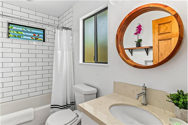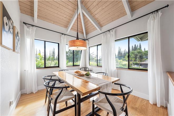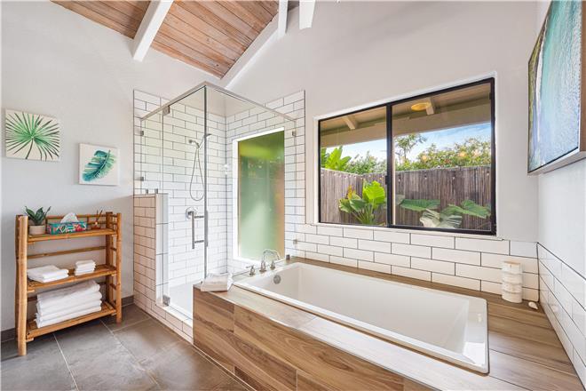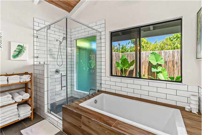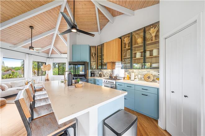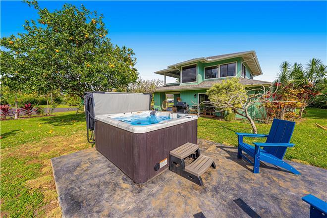 Visiting chefs will love the incredible, open-concept kitchen complete with a suite of high-end stainless steel appliances and an island with counter seating for quick meals or just chatting with the cook. Settle in for more formal meals in the nearby dining area or indulge in an alfresco experience on the furnished and shaded upper-level deck. Head out to the lanai and the lush yard adorned with white, pink, and purple plumeria trees, protea flowers, and a variety of fruit trees, including tangelo, lemon-lime, and papaya. Rejuvenate with a soak in your private hot tub, or open a chilled bottle of wine from the wine cooler and gather around the firepit to gaze at the stars.