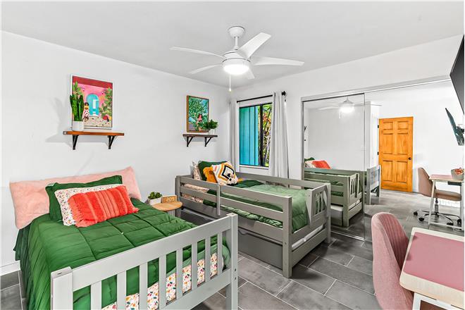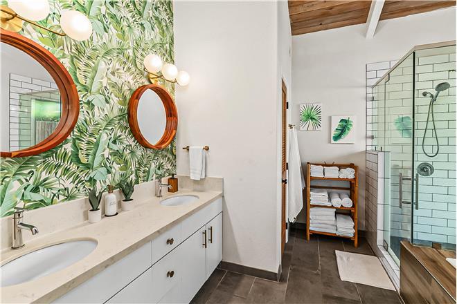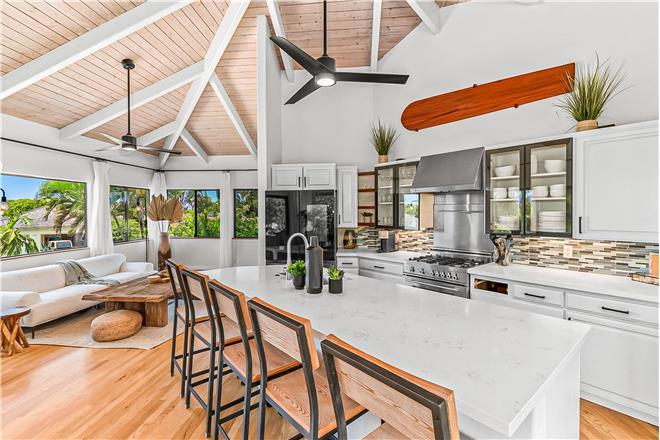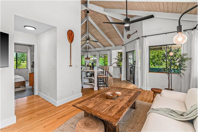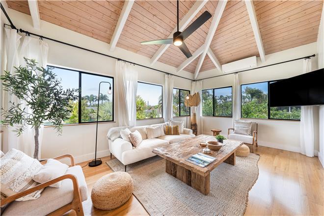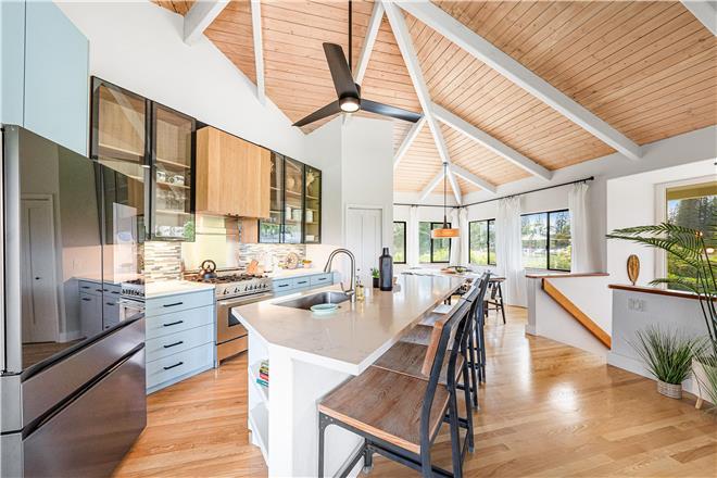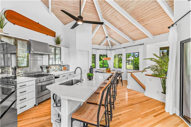 The open, bright, and airy interior features soaring ceilings and walls of windows welcoming in views and abundant sunshine. Unwind into vacation mode with your favorite TV show in the living room, or hangout in the garage - offering another great space to lounge.