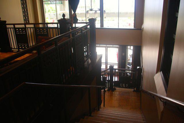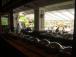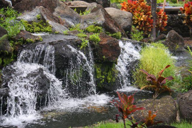 Environment/Dcor: Indoor and outdoor seating next to koi ponds, waterfalls, and landscaped pool gardens at a resort.