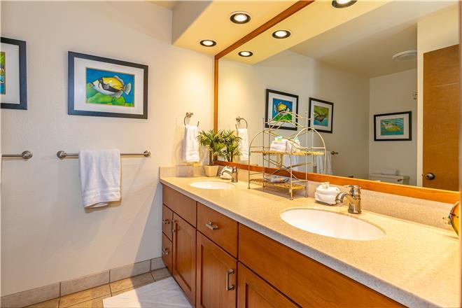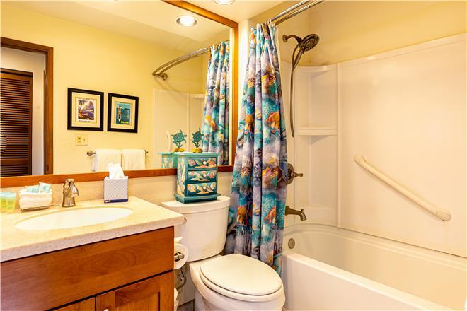 This unit sleeps up to six (6) people with a Queen bed in the master bedroom loft, a king bed in the second bedroom on the main floor, and a pull-out sofa bed in the living room. The King bed in the second bedroom can be converted to two twin beds by request at the time of booking (please call our office to arrange for a bedding change). The bathroom in the master bedroom has a large vanity and a shower with a tub. The guest bathroom also has a very large mirror on the vanity and a shower with a tub. The kitchen in the unit has large counter space and sufficient appliances for your convenience and the living space also boasts a large dining table for you to share your family meals. This unit has complimentary internet and Free long-distance to the US Mainland and Canada.