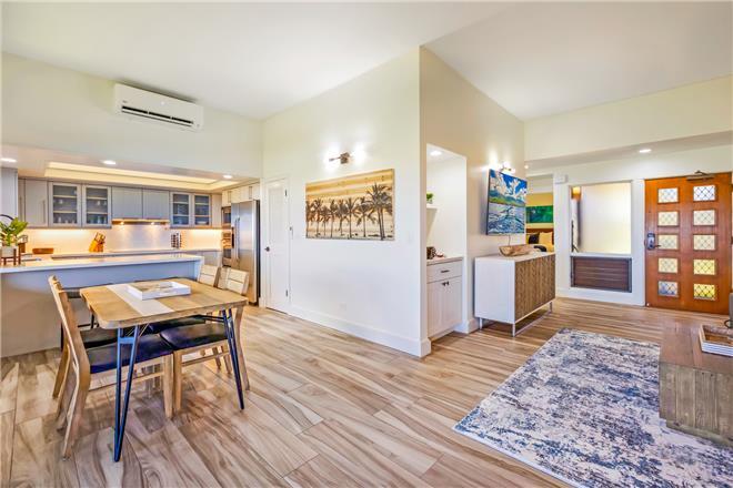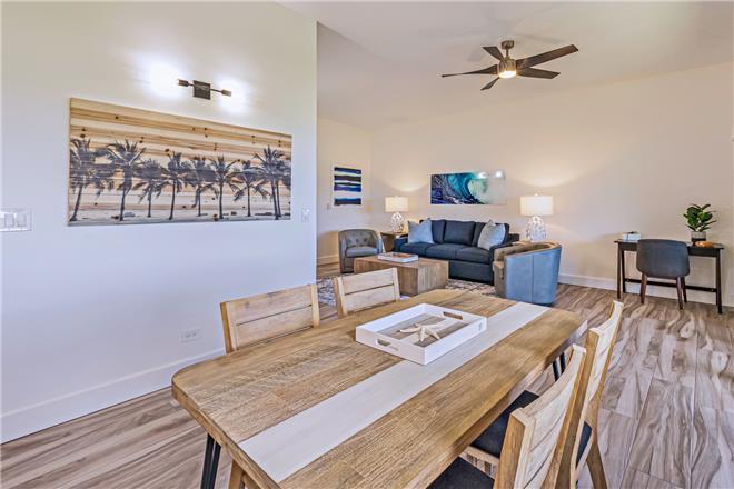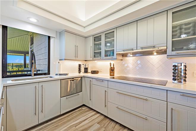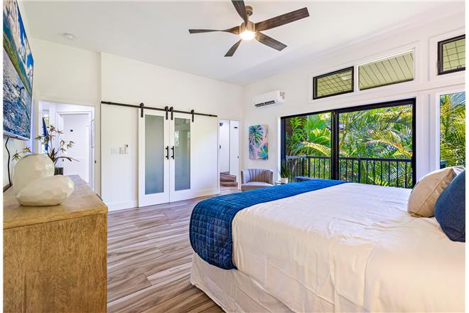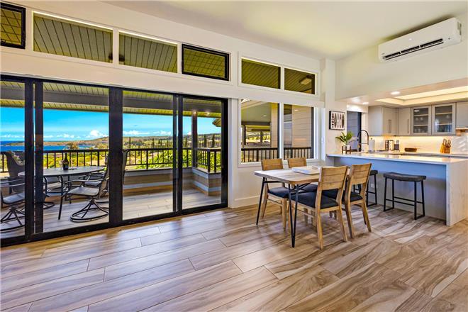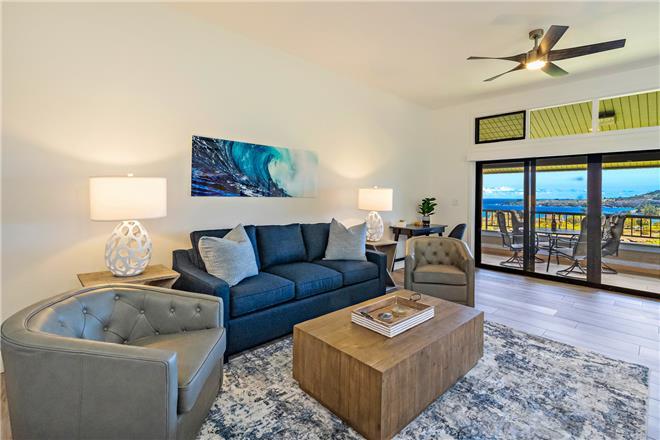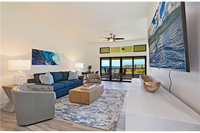 Step into soaring-ceiling elegance where natural light, breeze, and panoramic views are part of the welcome. The open-plan living area features a queen sleeper sofa, smart TV, and A/C to keep things comfy, while wide sliders draw the eye (and footsteps) straight to the view-deck lanai.