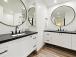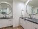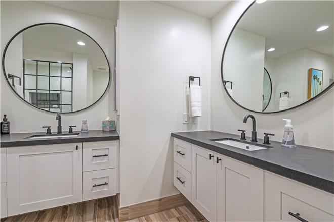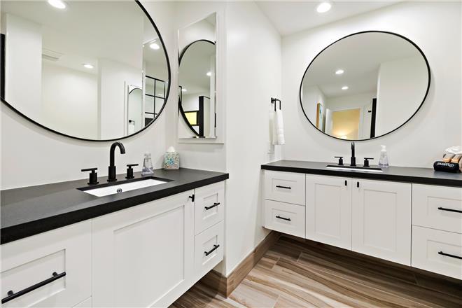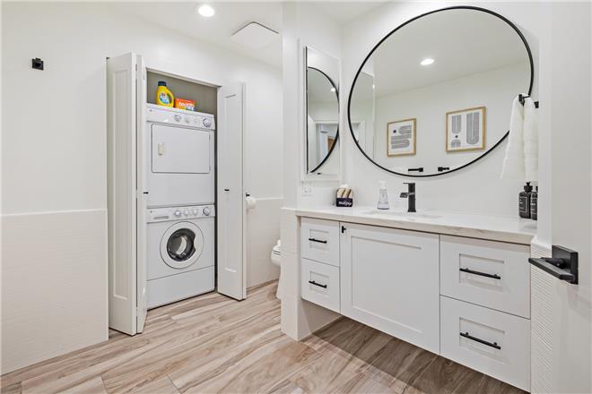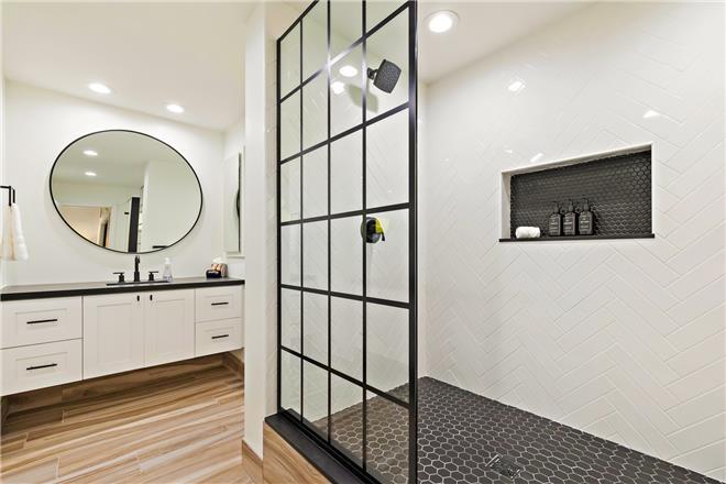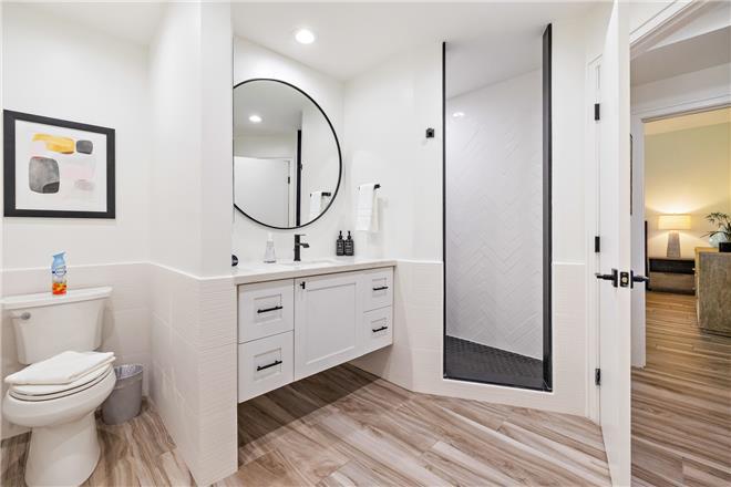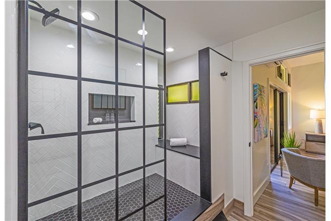* Refined Remodel (2022) Porcelain tile, quartz counters, herringbone bath tile, and curated furnishings elevate every inch.