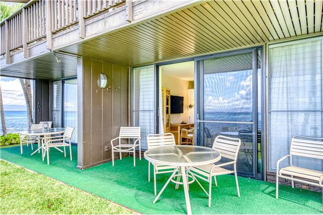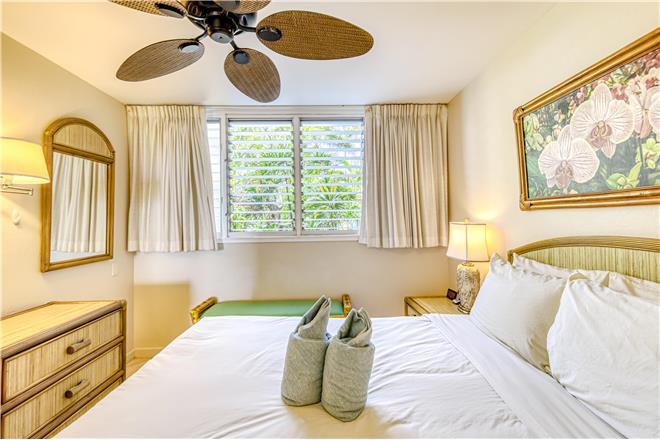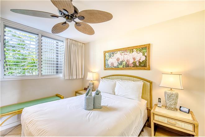 Set up for comfort and ease, this condo on the ground floor is ready to welcome guests to the island. Underneath the living rooms flatscreen TV, guests can work at remote assignments at a desk workspace. Guests can cook up something delicious in the full kitchen, complete with a French door refrigerator, plenty of counter space, and a dishwasher for easy cleanup. But you may be distracted by the lovely views just outside your private furnished patio.