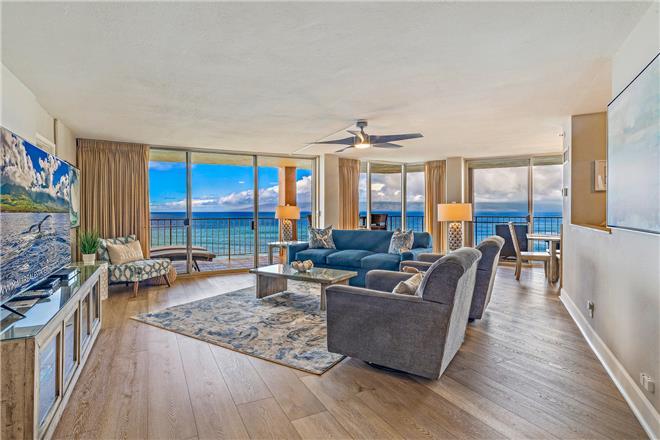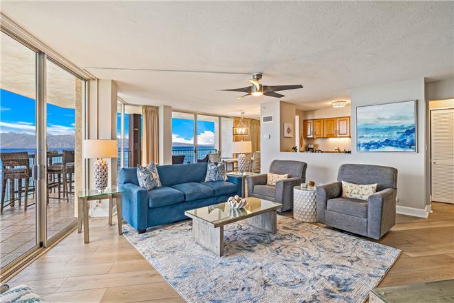 Welcome to Royal Kahana 1010, a stunning tenth-floor corner residence where uninterrupted ocean views stretch from the golden coast of Ka'anapali to the lush cliffs of Kapalua. Spanning 1,287 sq ft with 2-bedroom, 2.5-bath, and sleeping space for up to 6 guests, this oceanfront retreat offers a 40-foot wrap-around lanai with uninterrupted blue oceanperfect for sunset toasts, seasonal whale spotting, and the lullaby of waves below.