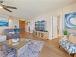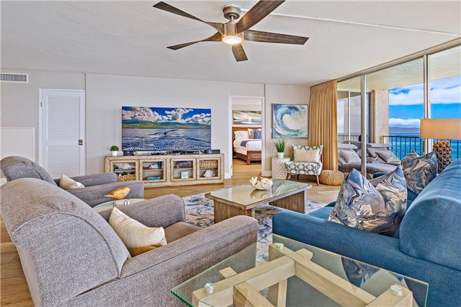 The open great room frames an endless ocean while a queen sleeper sofa, plush armchairs, and a 75 smart TV anchor the lounge. Six dine indoors; while the lanais table seats four for alfresco breakfasts or sunset mai tais.