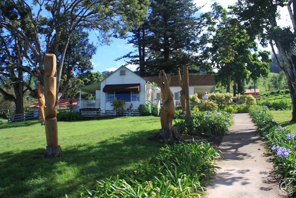 Some great art has been added to the grounds in recent years. The dynamic sculptures along the entry path to the Tasting Room were carved on the spot by local artist Tim Garcia, out of cypress trees planted back in the 1870's for the visit of Hawaii's "Merrie Monarch" King David Kalakaua. The ranch planted this ring of cypress trees for hula dancers to perform within, notice the artist tried to reflect this in the carvings. A small placard by the stairs to the Tasting Room reveals the details of this ceremonial circle, and why the trees were shaped into sculpture.