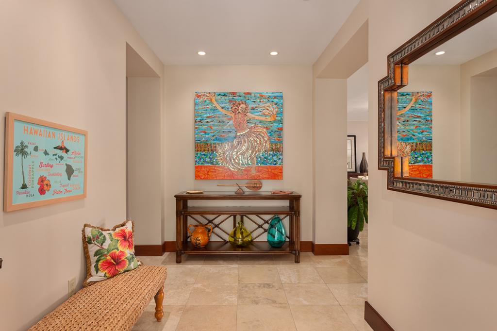 We named C201 as Castaway Cove Villa because this second floor corner accommodation reminds us of an idyllic tropical hideaway. Here you can vacation just steps from the azure blue Pacific, surrounded by verdant gardens blooming with vibrant flowers that are framed by gently swaying palm trees. We took classic neutral elements such as polished white marble, earth-tone granite, and deep mahogany woods, then we blended them with colors of the sea and sky to create an enchanting tropical themed living space.