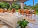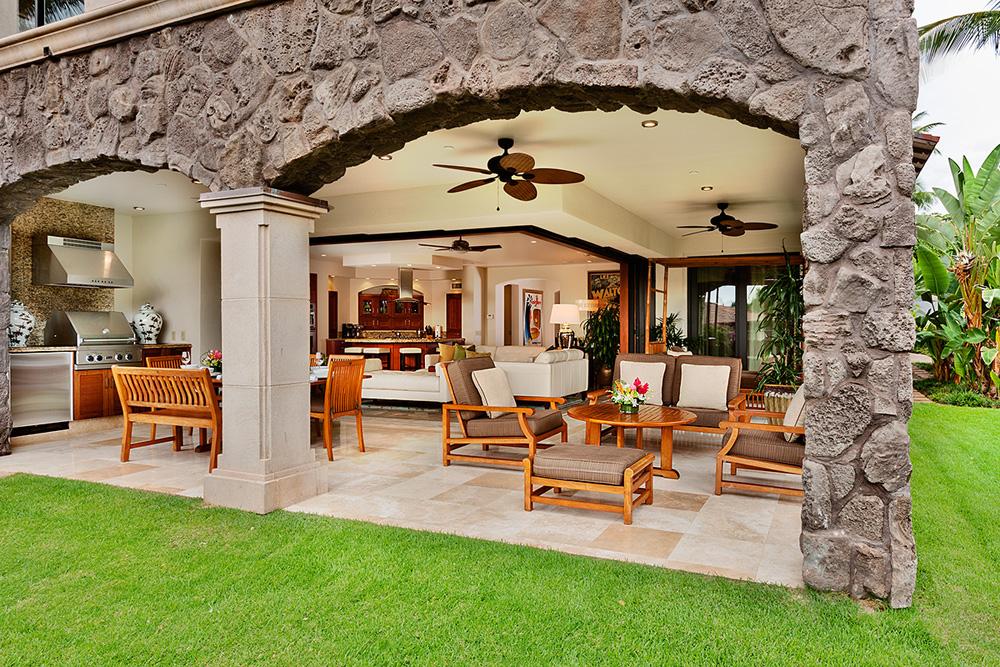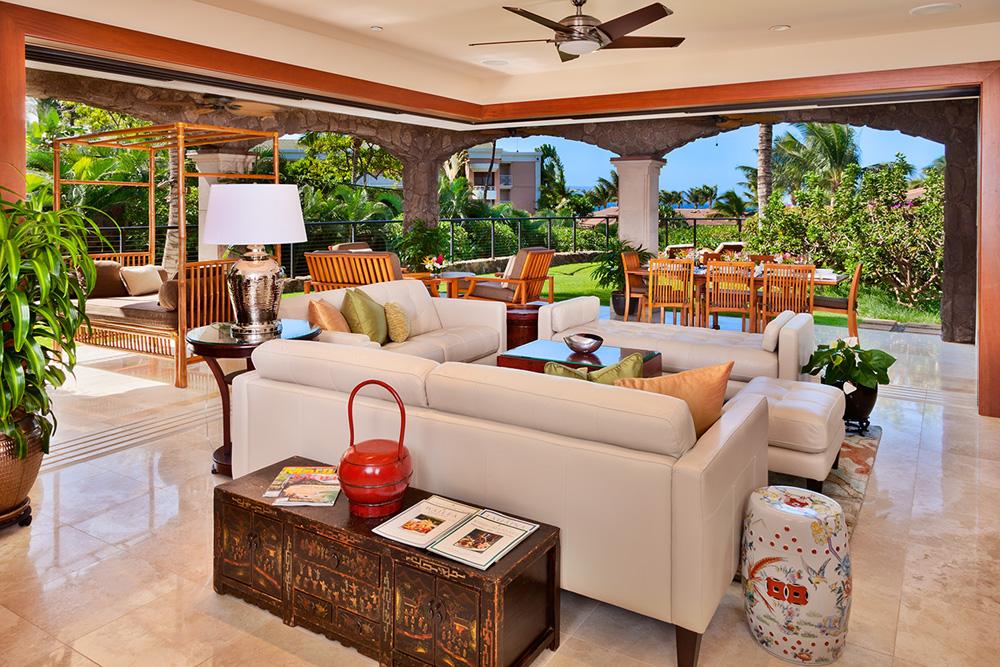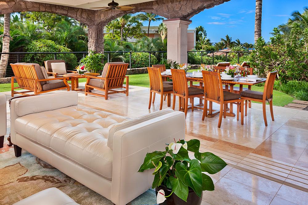 An assortment of teak outdoor living furniture makes it easy to sun and relax in your own hideaway - day and night. The oversized wrap-around indoor and outdoor patio is a special feature of G102. The great room flows directly outdoors to a covered patio for outdoor living without being exposed to the sun, and the Viking BBQ and bar fridge complete the outdoor kitchen. A large teak table set under roof in the garden is ready for family meals. Radiant natural sunlight flows through all of the rooms via the floor to ceiling glass doors and abundant windows. Solid glass and screen doors smoothly retract into hidden pockets, creating a complete open-air living experience. For cooling comfort, switch on the central air conditioning with individual room controls. A unique feature of G102 is the expansive rich green grass lawn and the surrounding border of colorful and delicate hibiscus flowers that are native to the tropics. The pretty yellow and orange flowers serve as the inspiration for the color scheme of the great room and for the villa name.