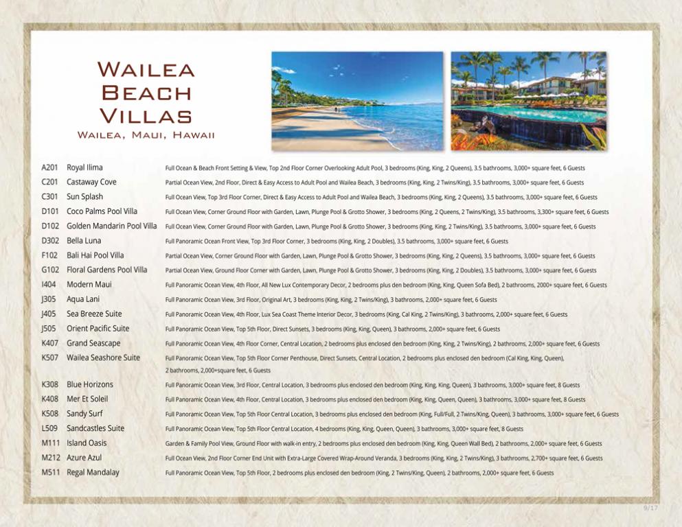 The resort is gated with on-site security, and no public access. It’s a safe, secure, secluded, and provides a quiet setting.Stroll directly into the expansive Shops At Wailea from the exclusive key-card controlled gate that exits the Wailea Beach Villas and leads directly into the "Shops". Open daily until 9pm for easy and convenient take-out meals (choose from 5 different restaurants), deli supplies, liquor, and all types of upscale boutique and designer goods shopping, including world-class original art galleries.The site plan for Wailea Beach Villas was thoughtfully created with spacious low-rise and low density residences of supreme quality, a combination available exclusively at this beachfront Maui Island resort.Many of the villa owners are long-term residents, so the project has a distinctly residential ambiance, that is enhanced by exceptionally lush tropical landscaping and lightly used amenities that include two heated pools with hot tubs, a fitness room, a billiards room, and group dining and meeting spaces.Each of our villas have exceptionally well-equipped kitchens, with all kitchen goods kept in excellent clean condition. Almost every conceivable device and appliance is provided, as well as a full array of serving items, so you can comfortable cook and dine in style and with ease.Each of our villas have all HD large flat panel televisions with bona-fide HD cable boxes and HD service subscriptions, DVR’s for recording programs while at the beach, and most villas have NETFLIX accounts for unlimited TV show and movie viewing! Some villas have gaming devices, and others are now adding Apple TV consoles.Exceptional housekeeping and cleanliness standards, and extraordinary amenities stocked inside your villa such as full-size laundry soap products, fresh robust coffee, and much more.Dreamy ultra-high thread-count 100% cotton bed sheets, mattress pads, pillows, and down duvets to coddle you to sleep.Guest service and property management service led by a team of former "Four Seasons Hotel" professionals, who work to achieve comparable or superior standards when evaluated in comparison to the 5-star hotel industry.And...a gentle reminder that our posted “Affordable Luxury” rates apply for all reservations. Reserve at anytime, subject to availability. If we have availability, you get our posted already-affordable special reduced rates, even for last minute reservations. Rates vary by season, but are always an exceptional value for the quality of accommodation provided to you.Please call today for a reservation. Availability is subject to change until you secure your villa of choice with a partial deposit payment and a completed rental agreement.