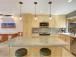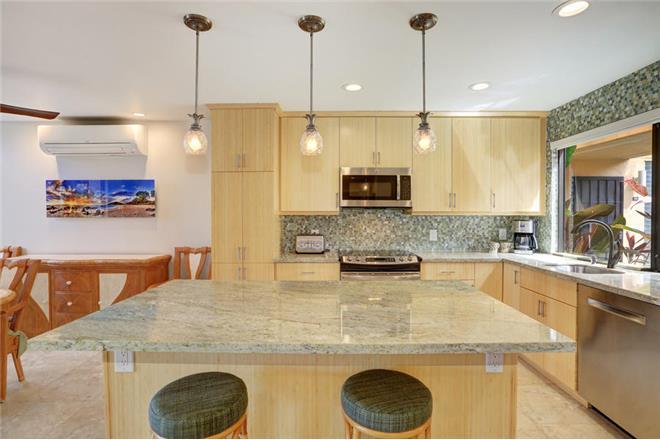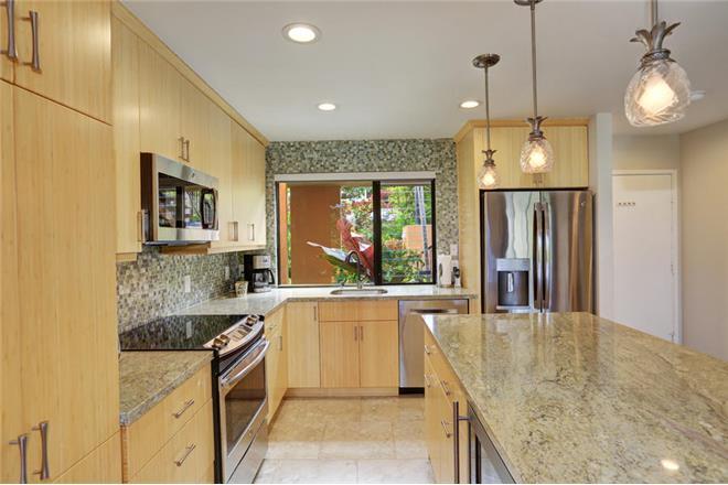 Renovated gourmet kitchen with island, bamboo cabinetry, and high-end appliances