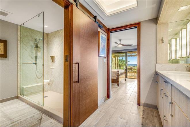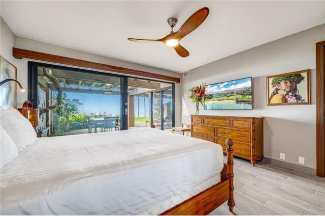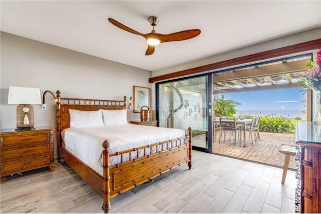Master Bedroom (Second Floor): King bed with sliding glass doors and en-suite bathroom featuring ocean views