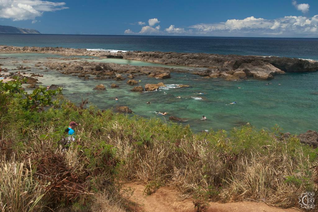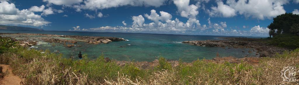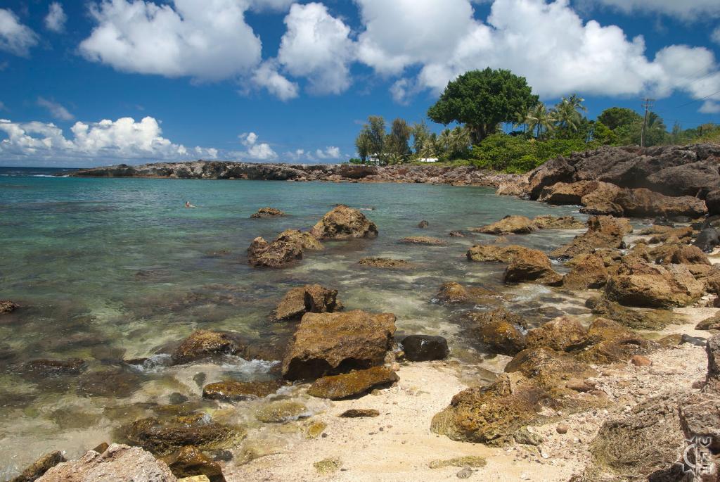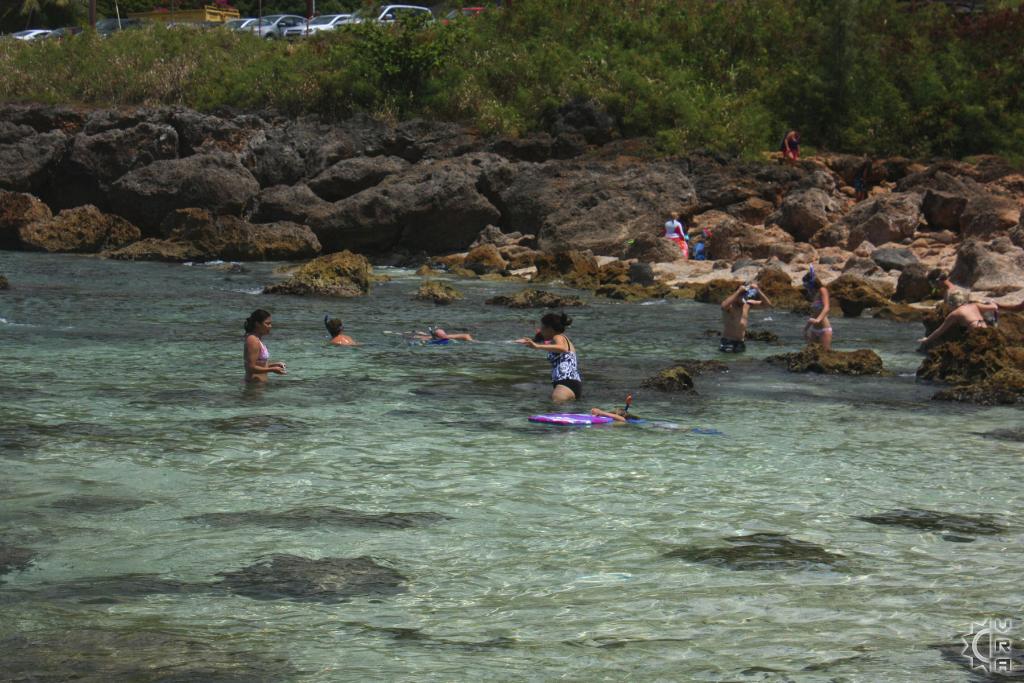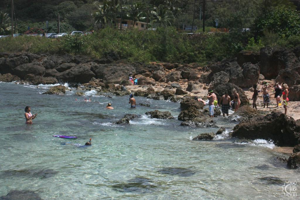An amazing snorkel and dive spot on Oahu's North Shore, this area offers variety of ways to interact with the ocean when calmer conditions prevail. The tide pool section is well-protected shallow ocean water tidal basin teaming with smaller sea life. Surrounded by lava rock, the bay gradually grows in depth revealing underwater caves hosting corals and larger sea life. For the experienced snorkeler the bay opening to the right of the pools is a great swimming and diving spot with interesting underwater topography and great variety of species.