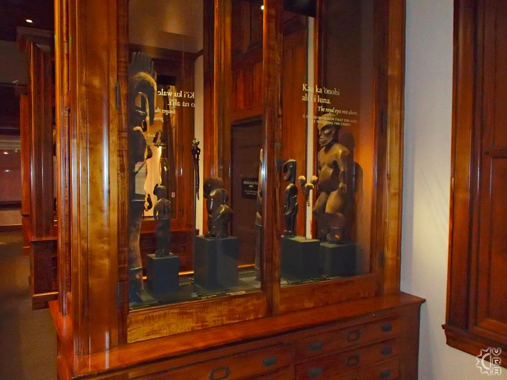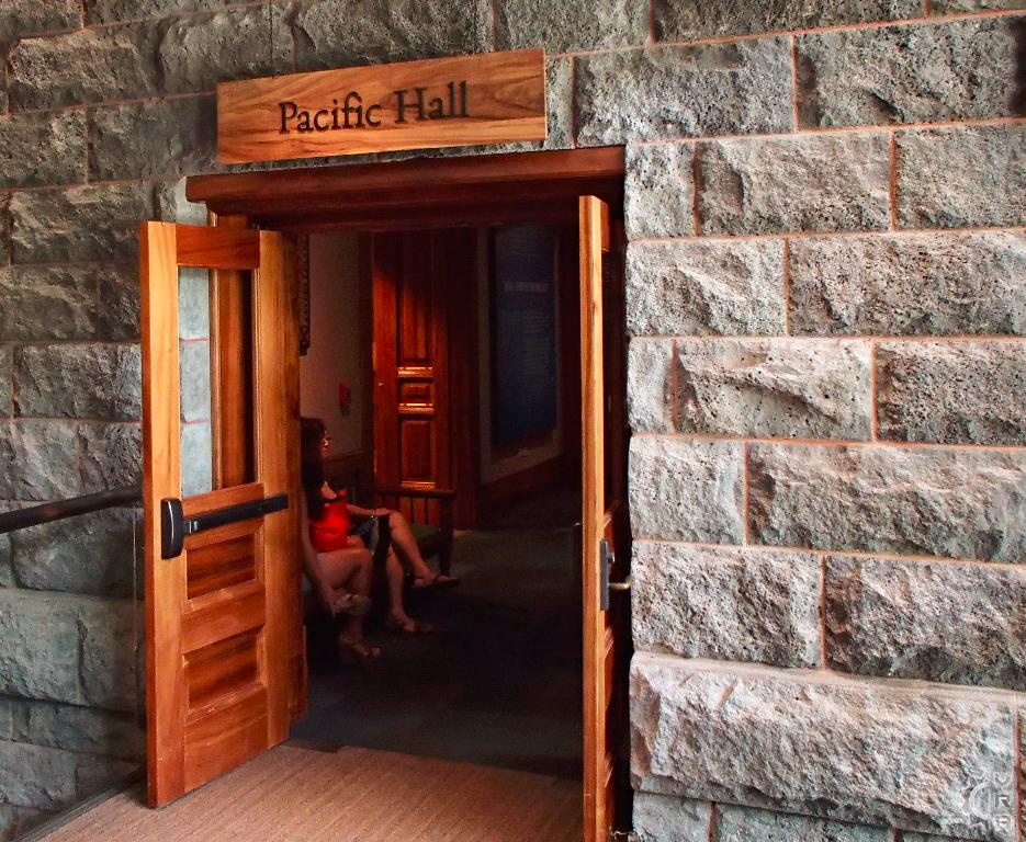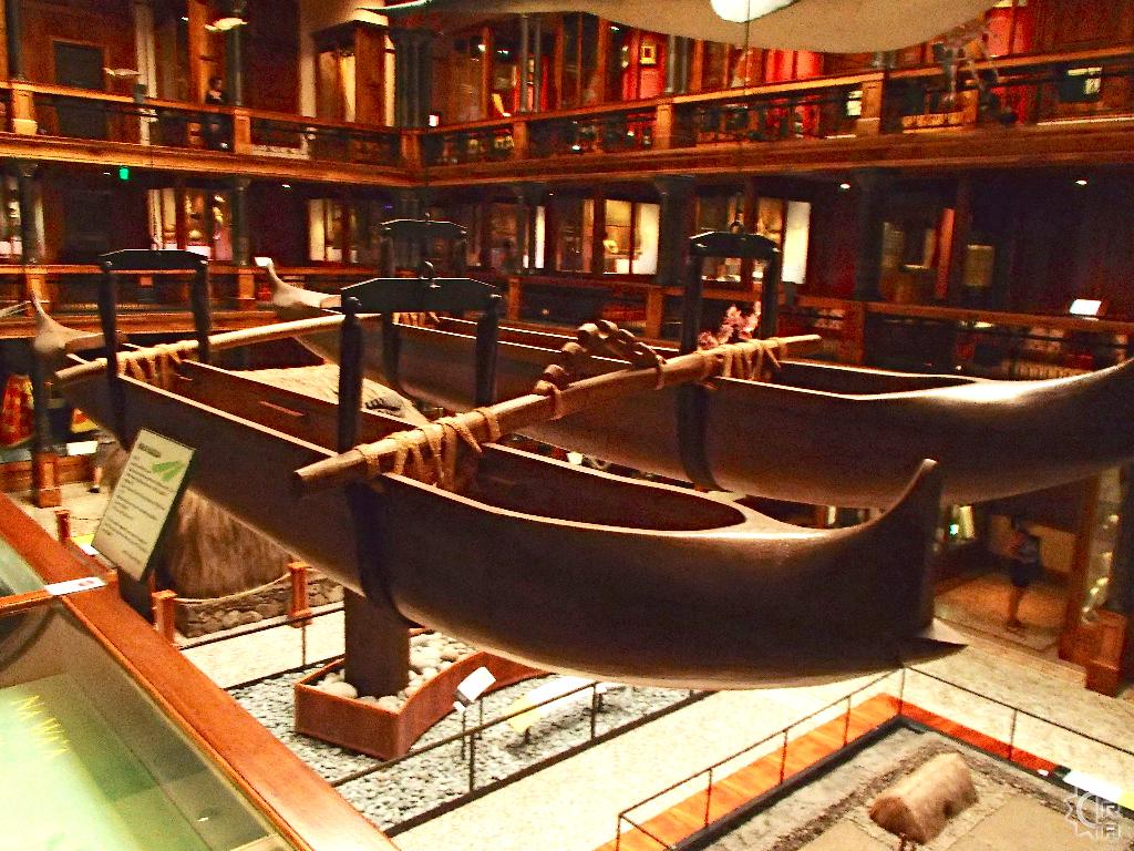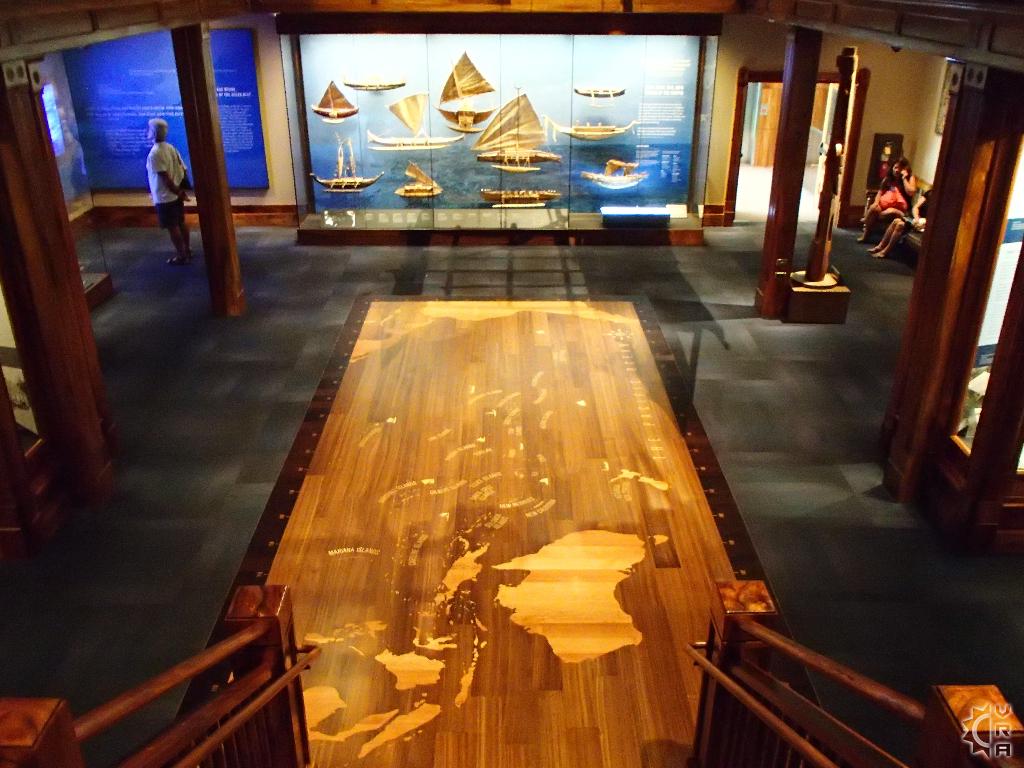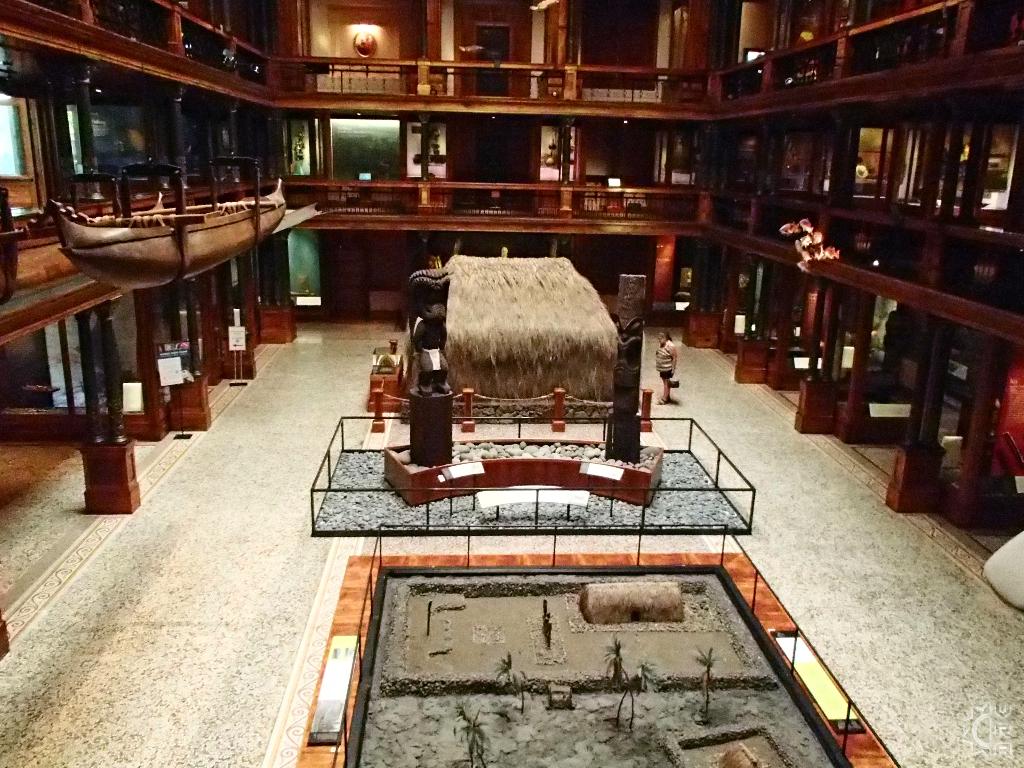 The 3-story tall main hall was renovated in 2006 and designed to give visitors a journey into the many levels of Hawaiian culture while changing floors. The realm of the gods, ocean and creation stories are found on the 1st floor, with the daily life of Hawaiian's and their interplay the natural world is featured on the 2nd  floor. On the top or 3rd floor the "Ali'i" (Alee-ee) or chiefs of the islands stories are told side by side with royal artifacts and some interpretive videos explaining historic evolution of Hawaiian culture. A huge replica whale hangs high above, dwarfed by this whale of a building whose ornate wooden floor to ceiling details create grandness in this expansive space.