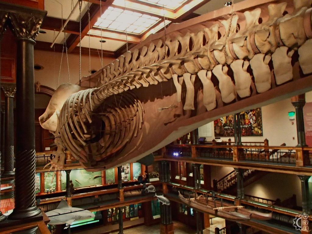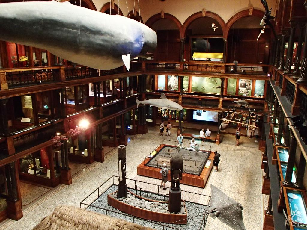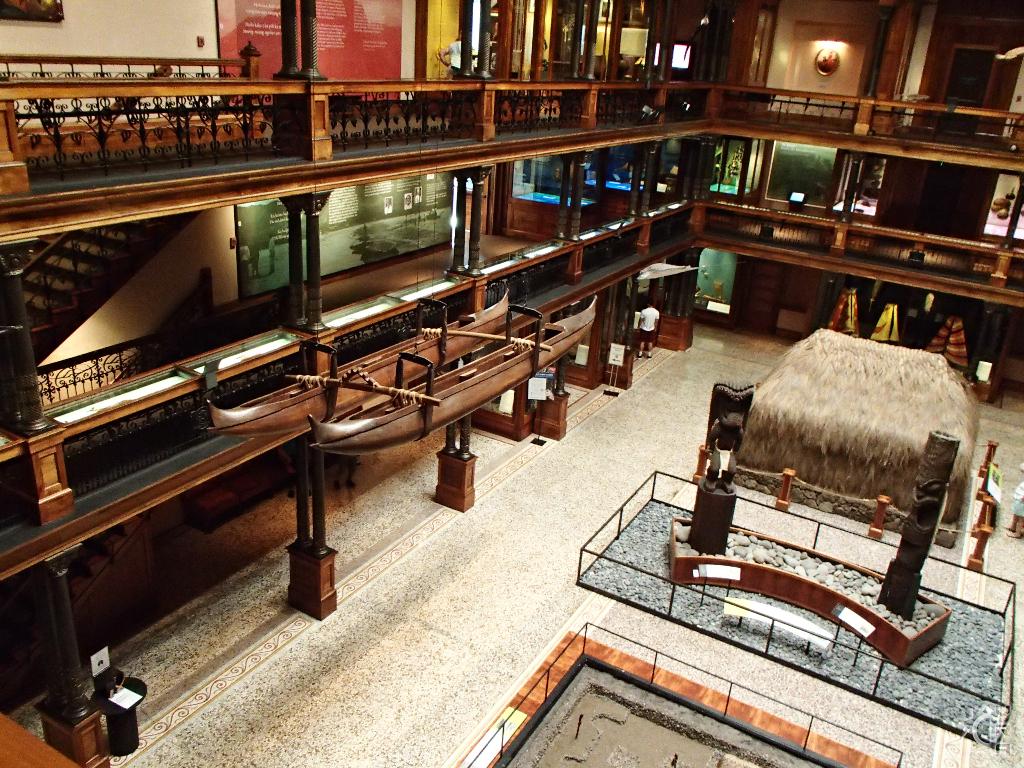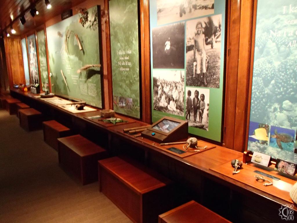 The 3-story tall main hall was renovated in 2006 and designed to give visitors a journey into the many levels of Hawaiian culture while changing floors. The realm of the gods, ocean and creation stories are found on the 1st floor, with the daily life of Hawaiian's and their interplay the natural world is featured on the 2nd  floor. On the top or 3rd floor the "Ali'i" (Alee-ee) or chiefs of the islands stories are told side by side with royal artifacts and some interpretive videos explaining historic evolution of Hawaiian culture. A huge replica whale hangs high above, dwarfed by this whale of a building whose ornate wooden floor to ceiling details create grandness in this expansive space.