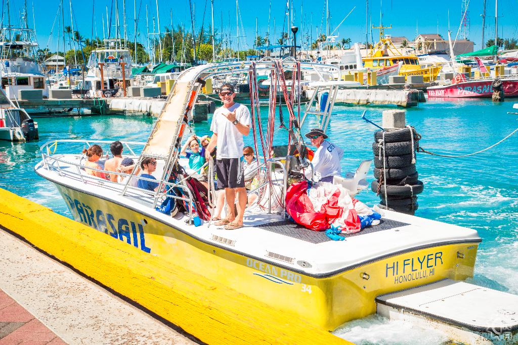 Once out of the Kewalo Basin, the boat heads to the open waters fronting Waikiki Beach and Magic Island to begin the first tour. There are 4 tour package options available, ranging from 5 to 11 minutes long and 500 to 1000 feet high. The "height" of the tour is determined by the length of the rope used. Beginning parasailers sometimes opt for a shorter rope so that they're a little closer to the boat, while other thrill-seekers want to fly sky-high at 1000 feet.
