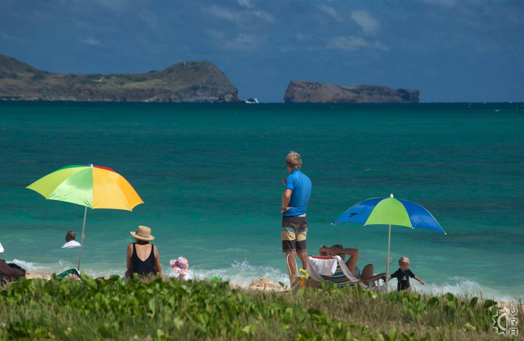 The combination of elements here is perfect. The brightest ocean water, shallow, warm and gentle, due to the off-shore reef buffering the surf. Trade winds cool the air and the sand is white and as soft as can be. The flat ocean often sparkles in the sunlight, highlighting the Mokulua islands bird sanctuary. Rows of beached canoes, and sailing catamarans create a colorful buffer between beach and the houses that line the shore. A day spent enjoying this beach is a magnificent experience, even if shared with many other sun worshippers. There is no such thing as a "bad day" on Lanikai Beach.