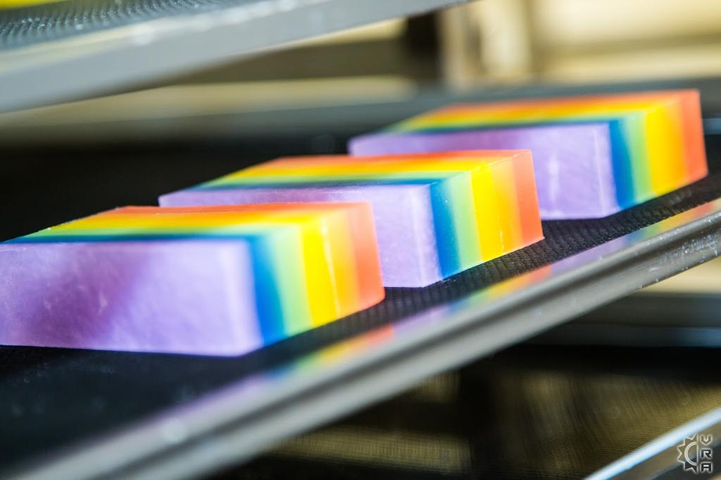 The shop fronts the soap making room, and is separated by a wall of glass so that visitors can watch the soap making process from beginning to end. Countless rows of multi-colored soap are placed on drying racks from floor to ceiling, and huge blocks stand to one side waiting to be cut. The soap maker is a true artist, creating bright patterns and colors in the soap and creating customized stamps to decorate the surfaces.