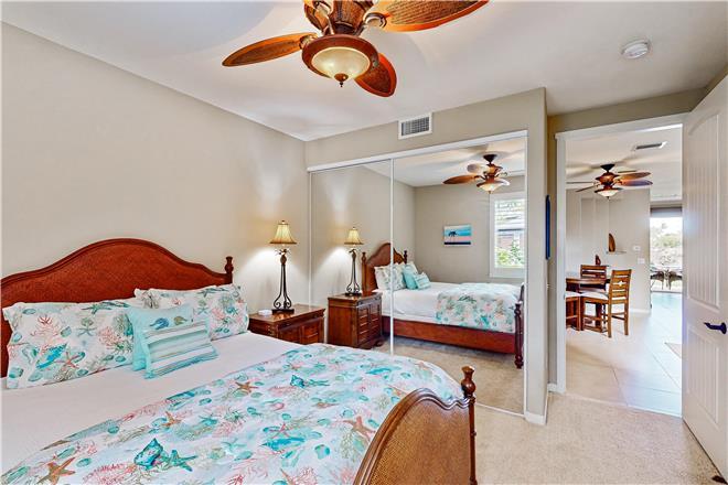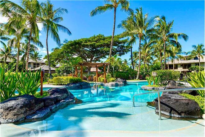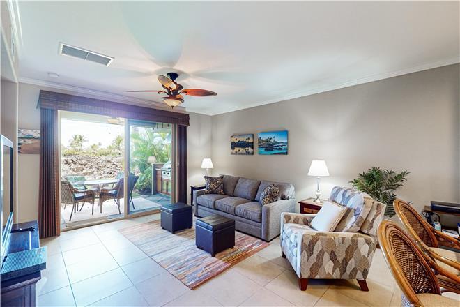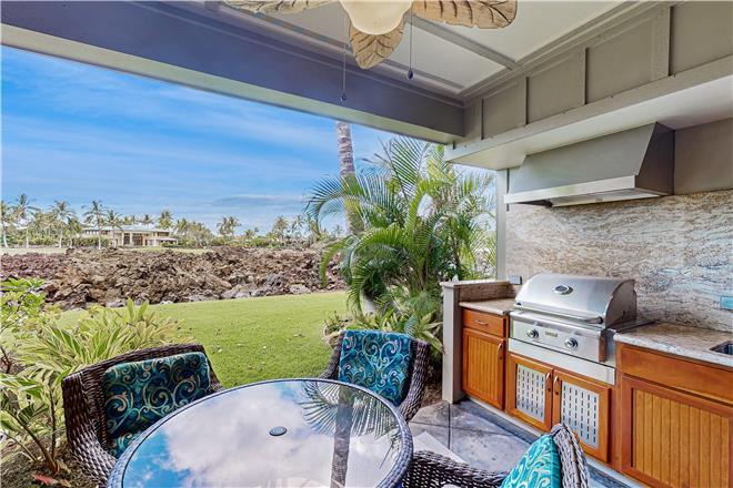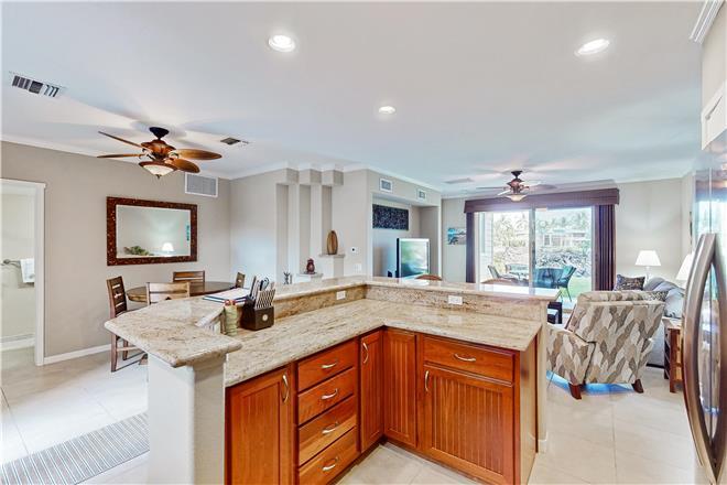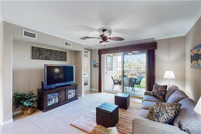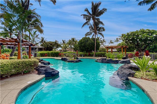 Escape to luxury in this stunning 2-bedroom condo nestled within the prestigious Mauna Lani Resort on the Kohala Coast of Hawaii. Located in the Golf Villas, this ground floor unit offers privacy and breathtaking views of the Francis H. I'i Brown Golf Course, with the picturesque hole number 10 just steps away. Additionally, an exclusive complimentary bonus package is included for all guests that stay at this unit: unlimited daily access to the Island's largest pool, a 175-foot waterslide, rope bridge, hot tubs, a sandy childrens beach, and much more at the Hilton Waikoloa Swimming Pools & Waterslides Step inside to find a beautifully furnished space with a spacious master suite featuring a master bath and double vanity sink, as well as a separate guest bedroom for added privacy. There is a dedicated office workspace with high speed GB internet, and the fully equipped kitchen is perfect for preparing meals, while the private lanai with a BBQ invites you to dine al fresco while enjoying the ocean breezes. Guests can enjoy resort-style amenities including a pool, hot tub, and air-conditioned fitness center. For beach lovers, access to the Mauna Lani Beach Club is just a short stroll away, offering opportunities for swimming, snorkeling, and sunbathing in paradise. Conveniently located within walking distance to the Mauna Lani Beach Club, and just a short bike or golf cart ride to shopping, dining, and beaches within the resort, this condo is the perfect retreat for those seeking relaxation and adventure on the Big Island. With its north-west orientation and shelter from direct sun, you can always count on cool and comfortable temperatures during your stay. Whether you're looking to unwind by the pool, explore the nearby golf courses, or simply relax on the lanai with a cocktail in hand, this luxurious condo offers the perfect setting for your Hawaiian getaway. Book now and experience the beauty and tranquility of the Kohala Coast at your doorstep.