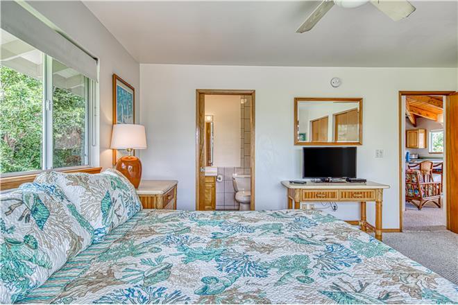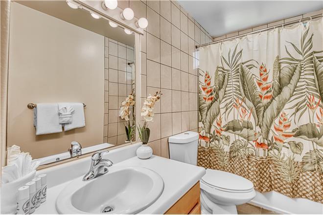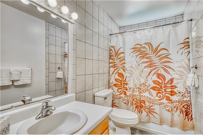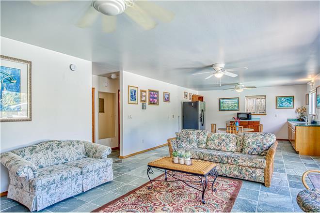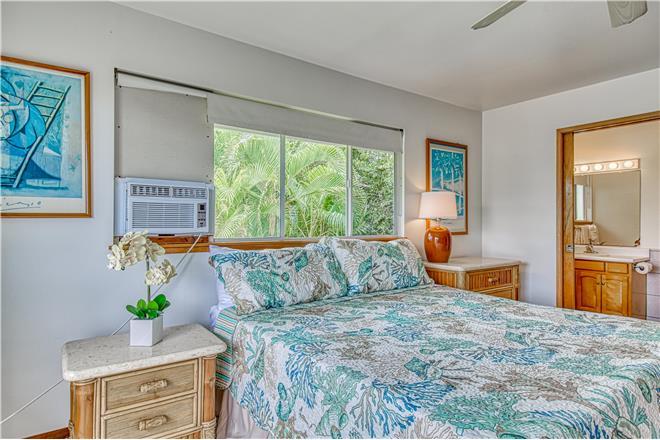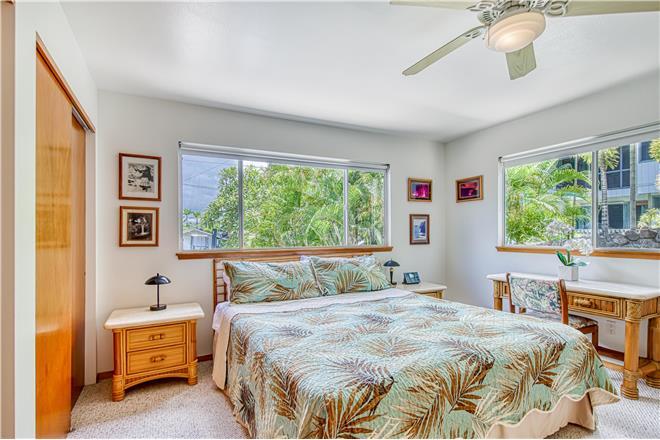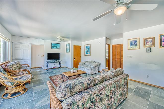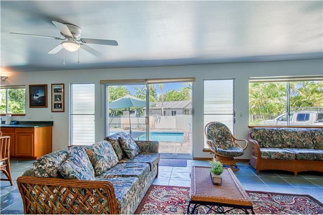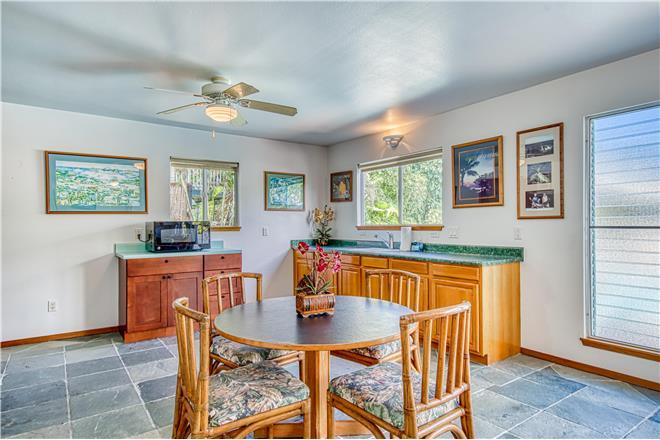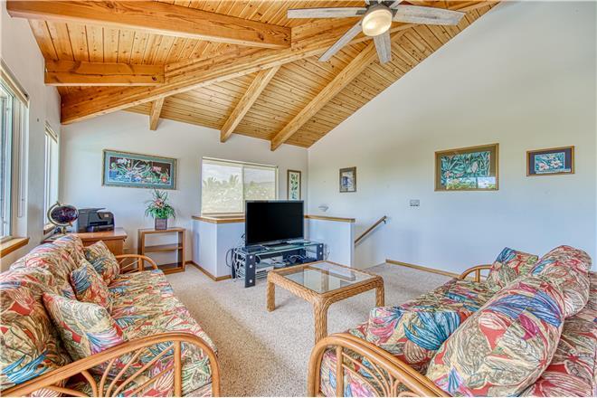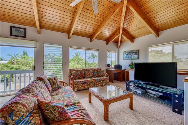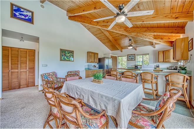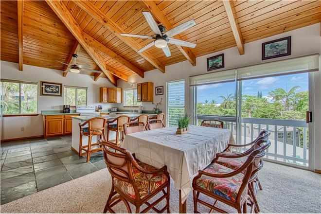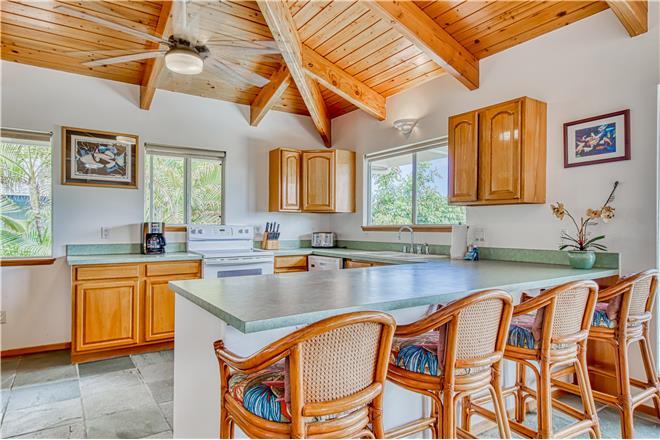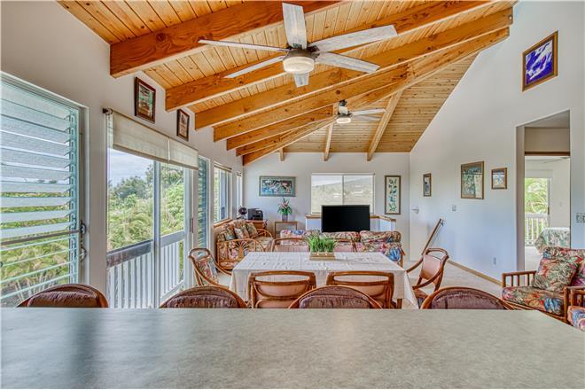 Make yourself at home in the main living space on the second floor, offering exposedbeam ceilings, windows on three sides that frame tropical greenery, and an airy layout thats only enhanced by opening the balcony doors. The living room has a pair of sofas and a bigscreen TV and entertainment system, while the dining room table sits in the light and the breeze of the sliding glass doors. The kitchen has every essential appliance including a doubledoor refrigerator and a dishwasher and a peninsula breakfast bar for four. An additional kitchenette with a refrigerator and a microwave awaits downstairs in the family room.