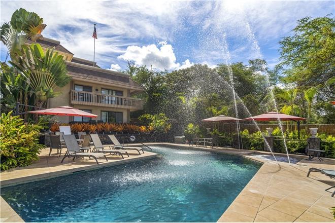 The Royal Kahili condominium complex enhances your stay with tropical landscaping, a community pool, a spa tub, koi ponds, and a fire pit table. Directly across from the ocean, the complex provides an authentic Hawaiian ambiance.