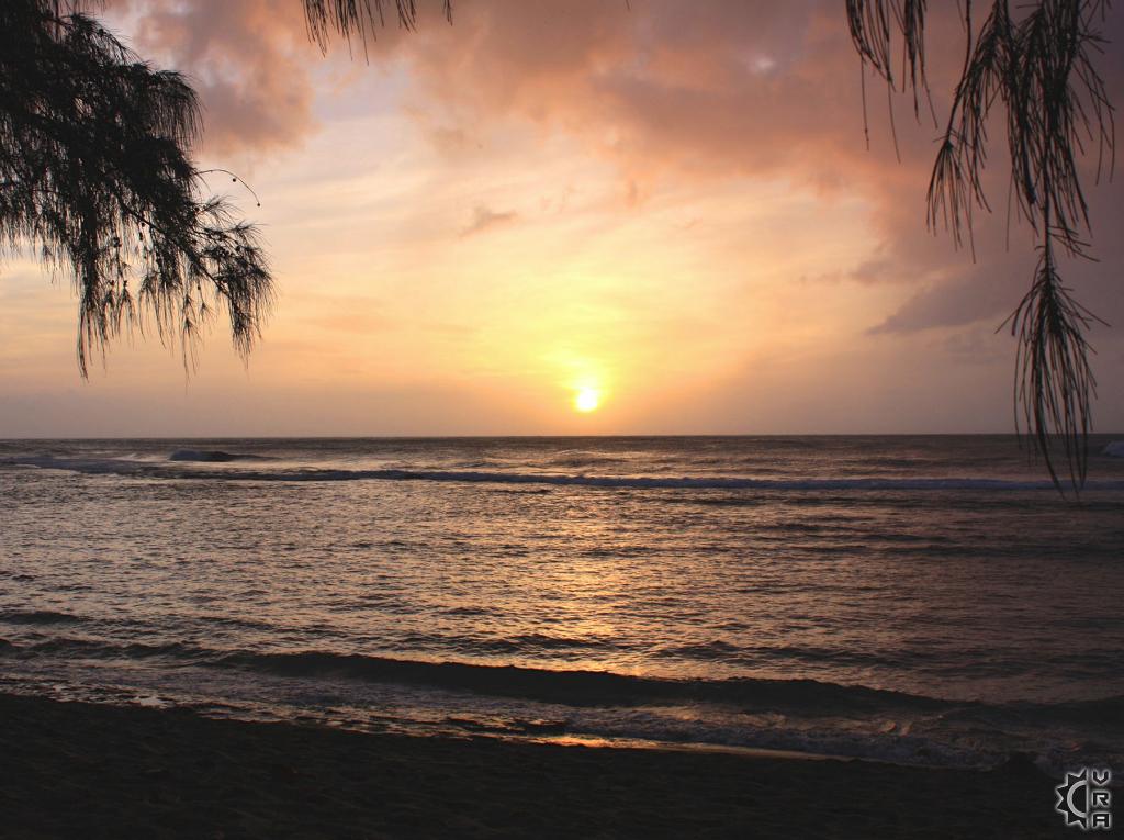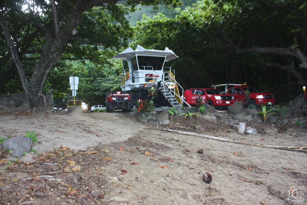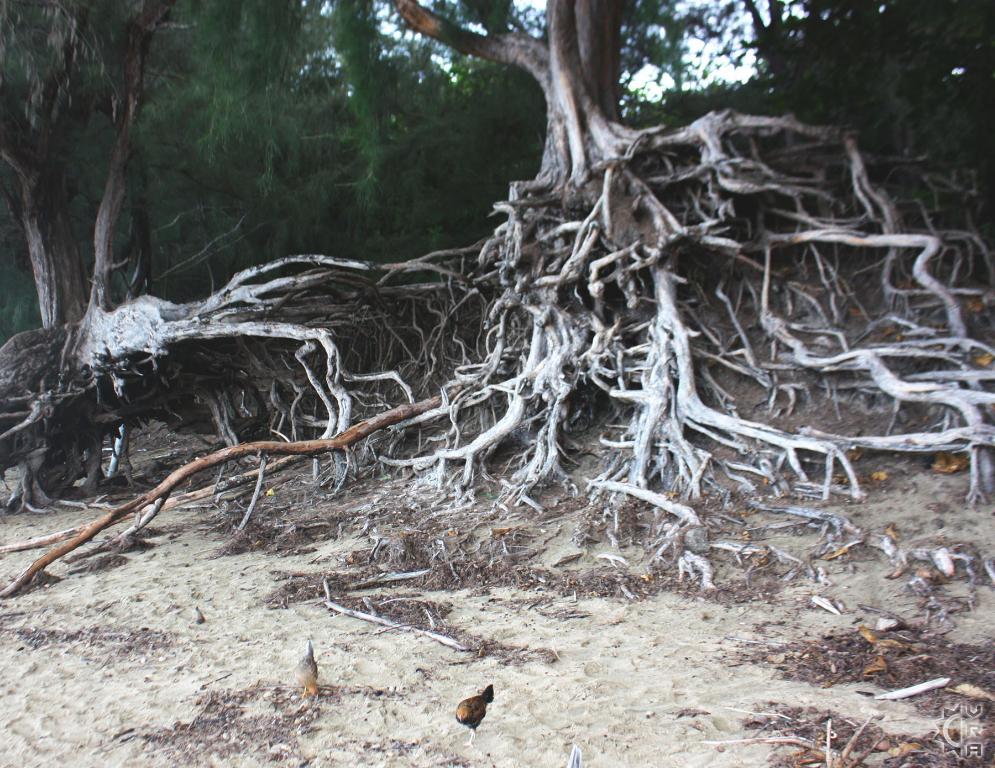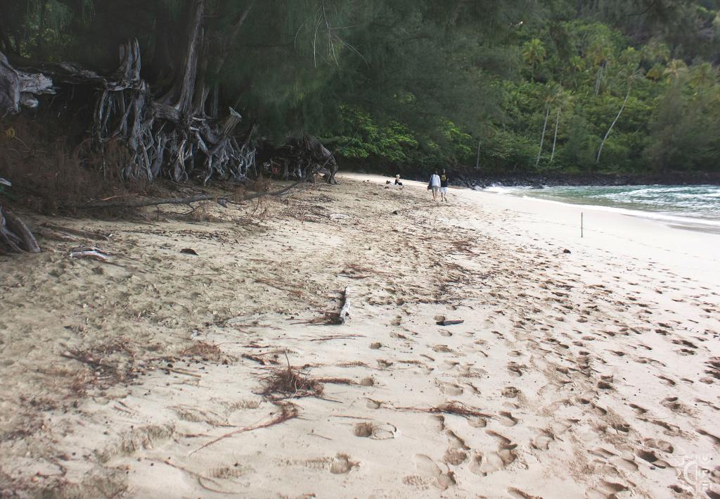 The beach here begins just of the parking area, in front of the lifeguard tower and stretches for miles along the coast wrapping around to connect with the County beach known as "Ha'ena". Don't be intimidated if the sands in front of the parking area look crowded. The further right you walk down the beach, the more your view increases and crowds decrease. A small but dense forest runs the length of the beach with many trees standing up on exposed roots seemingly poised as to walk off. The roots can make for useful shade depot, towel rack, picnic shelter or a sunset waiting room.