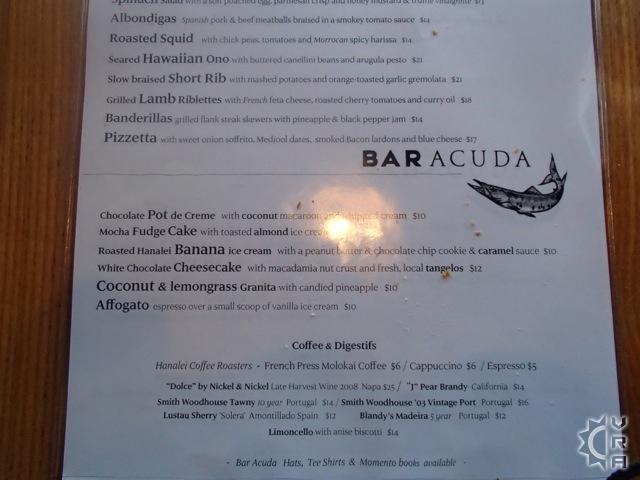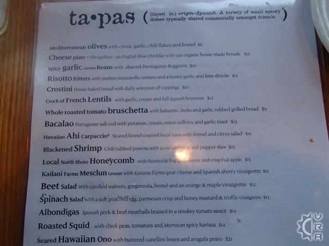 BAR Acuda's owner and head chef Jim Moffat grew up around European cuisine, and traveled the world with particular culinary interest in southern European and Mediterranean foods and flavors. These interests were first expressed in successful restaurants that operated for many years in San Francisco area. BAR Acuda, brings an island spin to Moffat's menu in the sleepy little town of Hanalei. Moffat and his crew have built relationships between local farmers, ranchers, and fisherman to get the freshest local ingredients possible. This is evident in the foods and drinks created at BAR Acuda. Don't be shocked as the portions are small as is often the case with tapas, but the taste sensations left us feeling surprisingly filled. The drinks menu has some inspired tastes in mixology, as well as great wine selection to accompany your tapas quite nicely. Be prepared to share dishes, because that is what the tapas are all about. Ordering 4 to 6 dishes to feed a party of two is common.