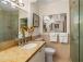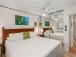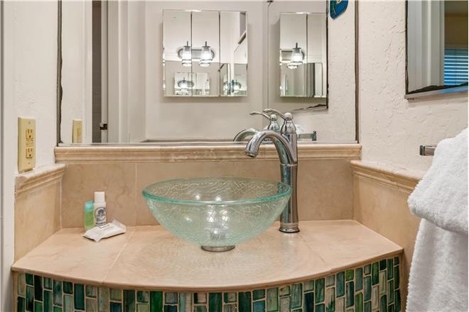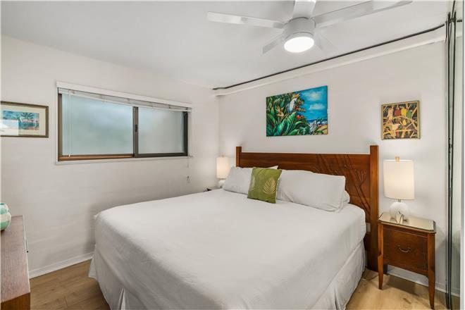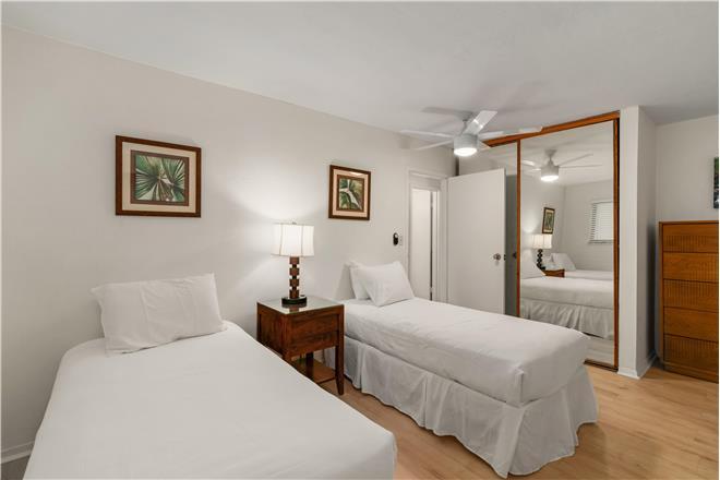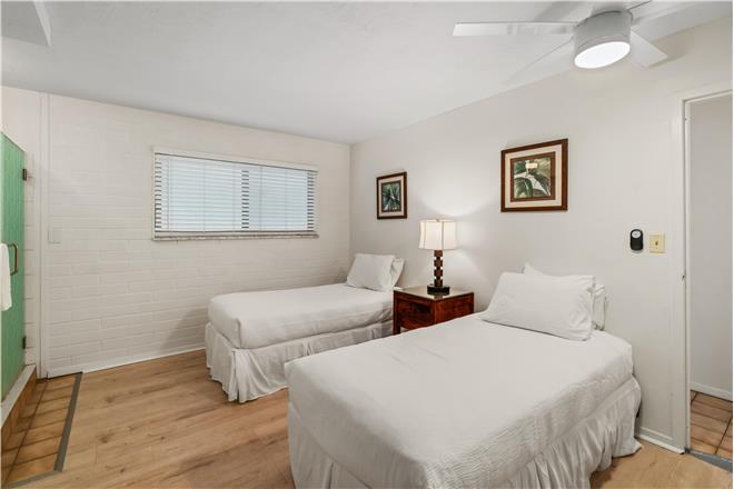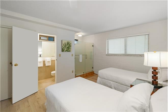 Retreat to the cozy main bedroom with tasteful tropical decor and ample storage. The main bath offers a granite vanity, large walk-in shower with glass doors, and designer vanity lights. The flexible second bedroom has twin beds (may be converted to king), a shower in the room, and a water closet with a sink and toilet.