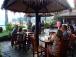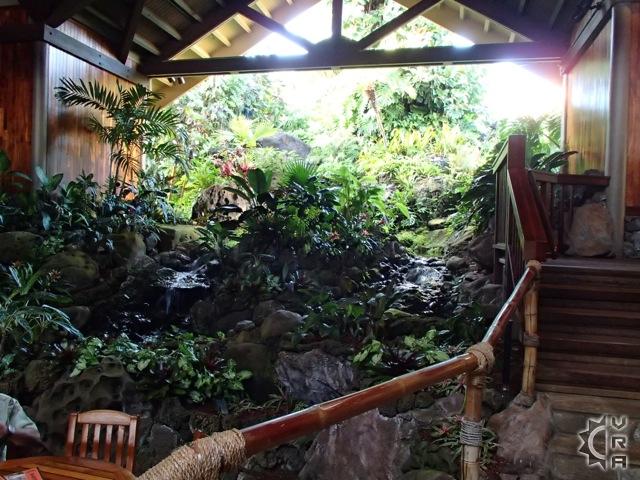 Environment/Dcor: Open airy chic classic "Tiki bar" Hawaiian with great decorative landscaping and a central koi pond and waterfall.
