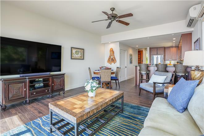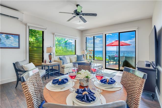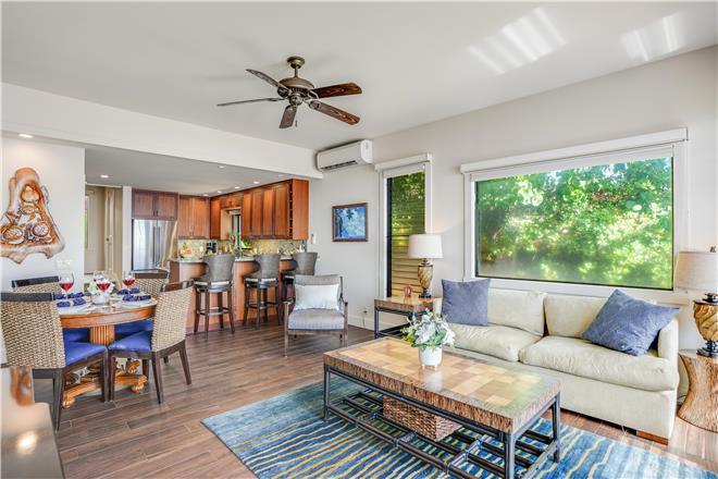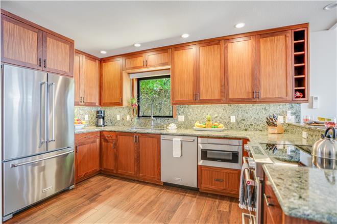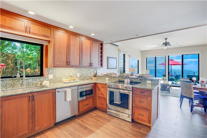 Flex your cooking muscles in the renovated kitchen, where youll find wood green Cambria quartz counters, custom afrormosia wood cabinets, and highend stainless steel appliances. Dine al fresco at the fourperson table on the lanai or eat inside at the fourperson dining table.