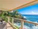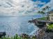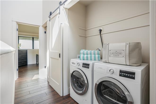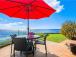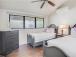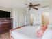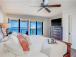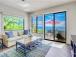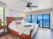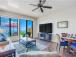 In the main bedroom, the crisp white linens on the luxurious bed contrast beautifully with the blues and greens of the ocean right out the huge picture window. The main ensuite bath comes with a quartz vanity and a large, luxurious walkin shower.