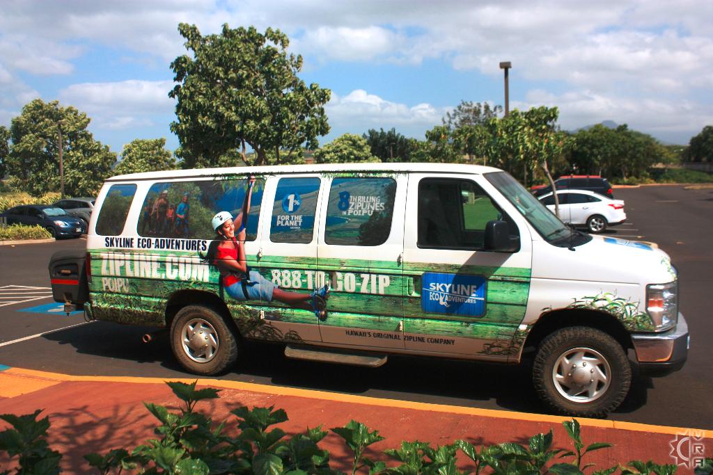 The Poipu Zipline base station gets you checked in and ready for your trip. Loaded in an air conditioned van, the 15 minute drive into the mountains from the office will bring you into a much cooler climate as you gain elevation and enter into the hills. The total adventure time varies by group size, but plan on 2 to 3 hours. You can bring only what you can carry with you as you zip along, so eating and hydrating are recommended prior to your zipline adventure. There are a few nearby shops with food and refreshments, and a restroom in the upstairs of the Poipu Zipline building, so fuel up and get ready.