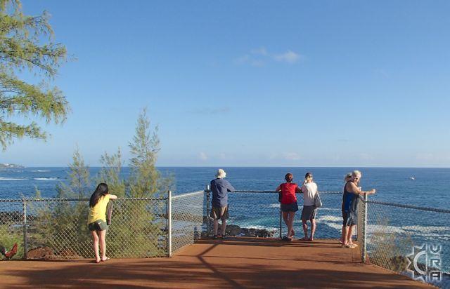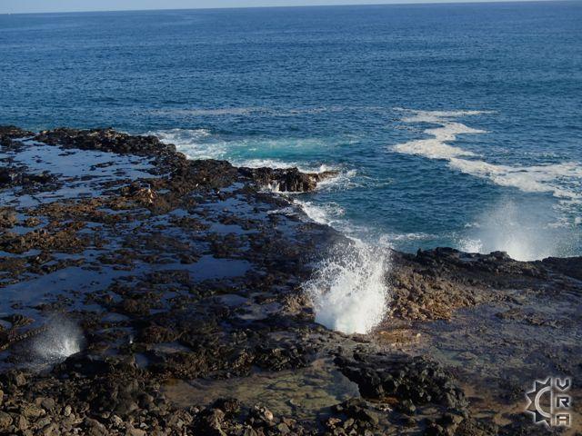 This naturally occurring phenomenon is very tidal and wave dependent. The waves from the ocean get compressed into the remnants of lava tubes that stretch from the ocean under the lava rock shelf below the spout lookout. Therefor the bigger the waves on the South Shore and the higher the tide the bigger the propulsion of forces that work together into making the spouting water fly higher. Similarly on a wave-less day there will be very little spout. Though not as spectacular a natural wonder as the Waimea Canyon or Na Pali Coast, Spouting Horn is worth checking out if in the Poipu area. There is a small outdoor mall of crafters who sell their local wears during the peak daylight hours. There are also a lot of free range chickens scurrying about in the park.