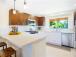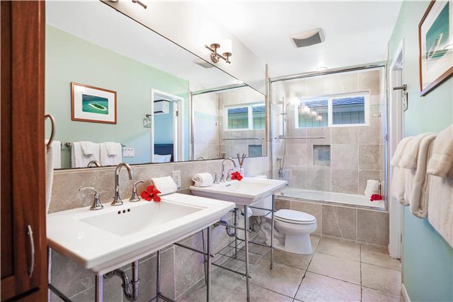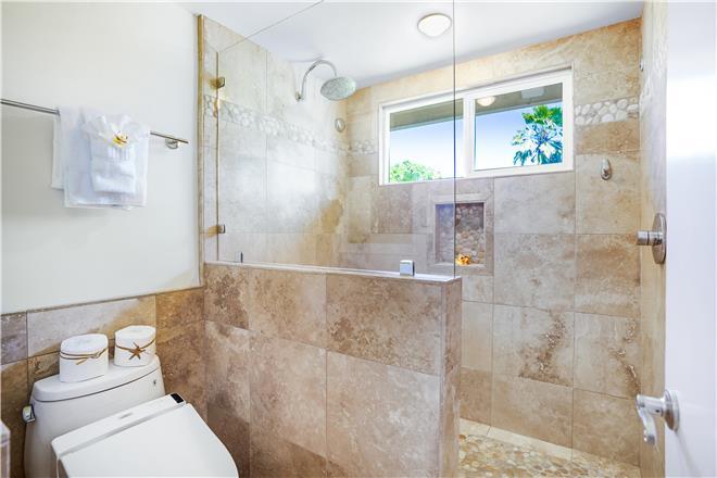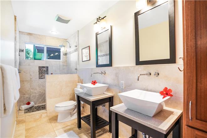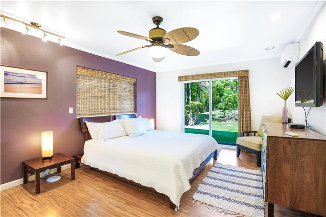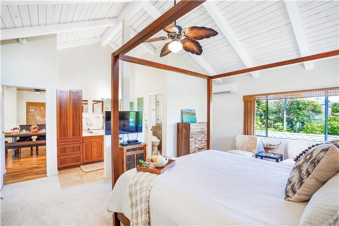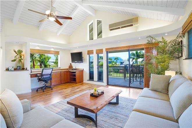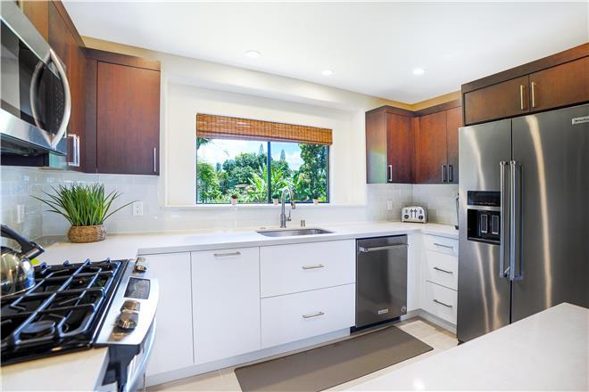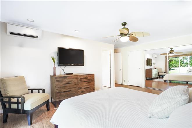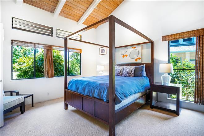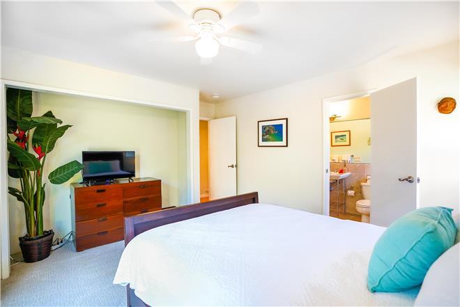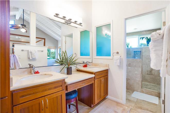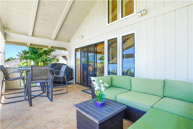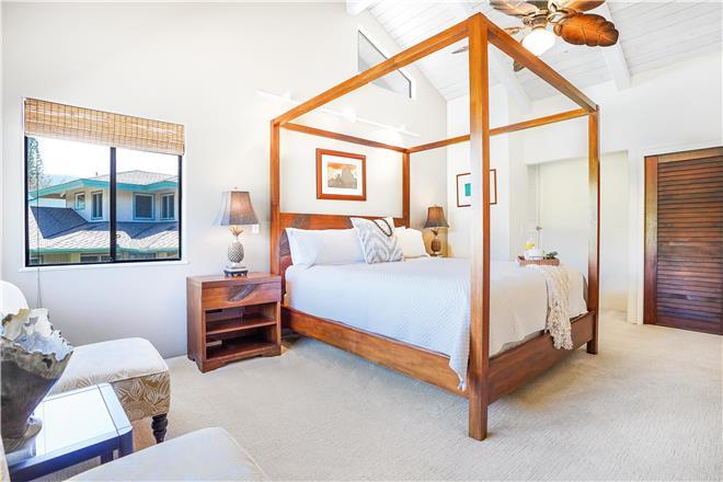 This wonderful, fourbedroom home is the spot for your next vacation, featuring two king master suites and two lovely rooms with queen beds. Take in the gentle island breeze out on the lanai with both mountain and distant ocean views, comfortable rattan furniture, and a gas grill. The lower level boasts three bedrooms and two bathrooms while the remaining bedroom is upstairs.