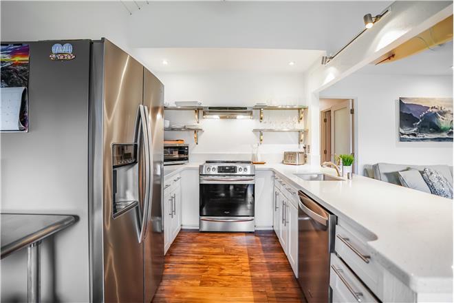 The refined, designer kitchen is open to the living room and dining room, offering exposed shelving, updated stainless steel appliances, and a peninsula breakfast bar for two. The dining nook has three walls of glass, allowing you to enjoy your breakfast, coffee, and newspaper with a lovely mountain view.