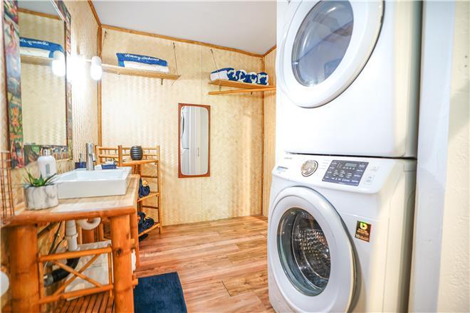 After a day spent golfing, kayaking, or snorkeling, youll return home to a stacked washerdryer for your clothes and swimsuits and an electric grill to begin dinner outside on the lanai. This newly tiled outdoor space is perfect for everything from morning coffee to drinks at sunset, with a vast yard, mature landscaping, tropical gardens, and sweeping mountain views just beyond.